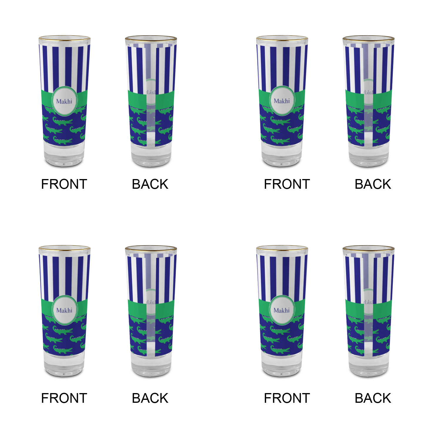 These glass shooter glasses are printed in full color with the design of your choice. These are a tall shooter 2 oz size and stand 4" tall. The print is a full wrap design to boldly display your personalization.