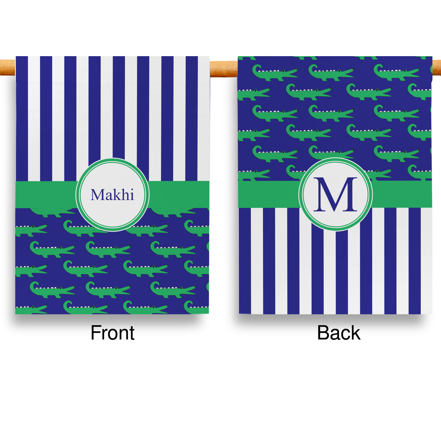 These are the sweetest alligators around! Our adorable green alligators pop and come alive on a blue background. To coordinate the alligator design a bold blue and white striped pattern is added to the top.