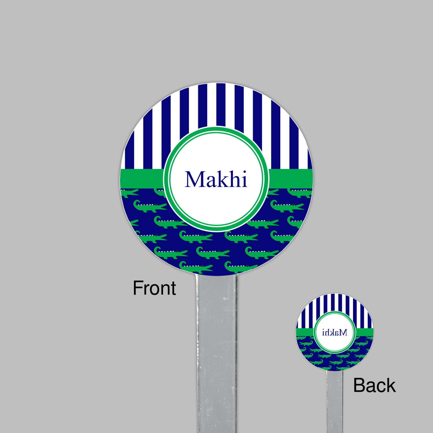 These are the sweetest alligators around! Our adorable green alligators pop and come alive on a blue background. To coordinate the alligator design a bold blue and white striped pattern is added to the top.