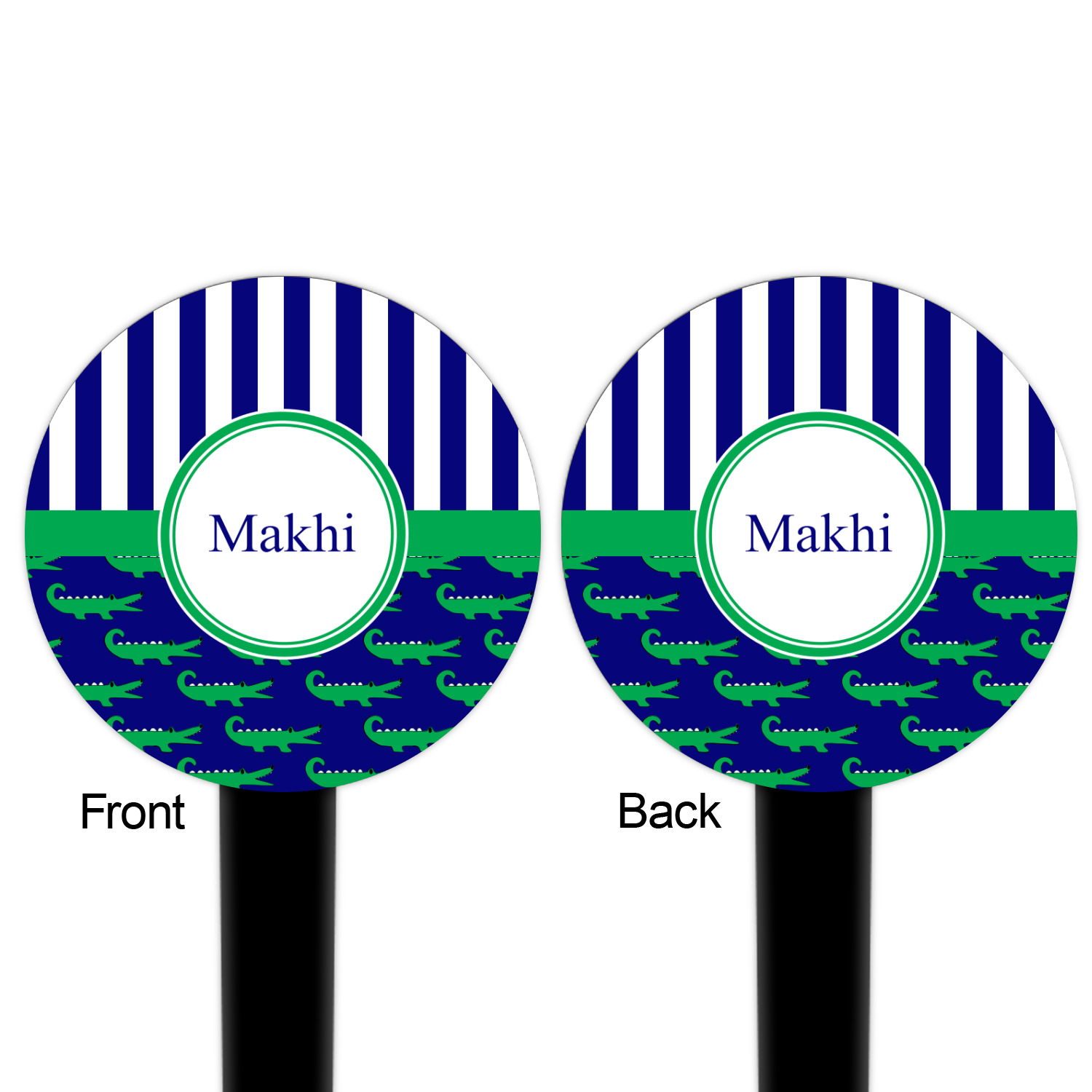 These are the sweetest alligators around! Our adorable green alligators pop and come alive on a blue background. To coordinate the alligator design a bold blue and white striped pattern is added to the top.