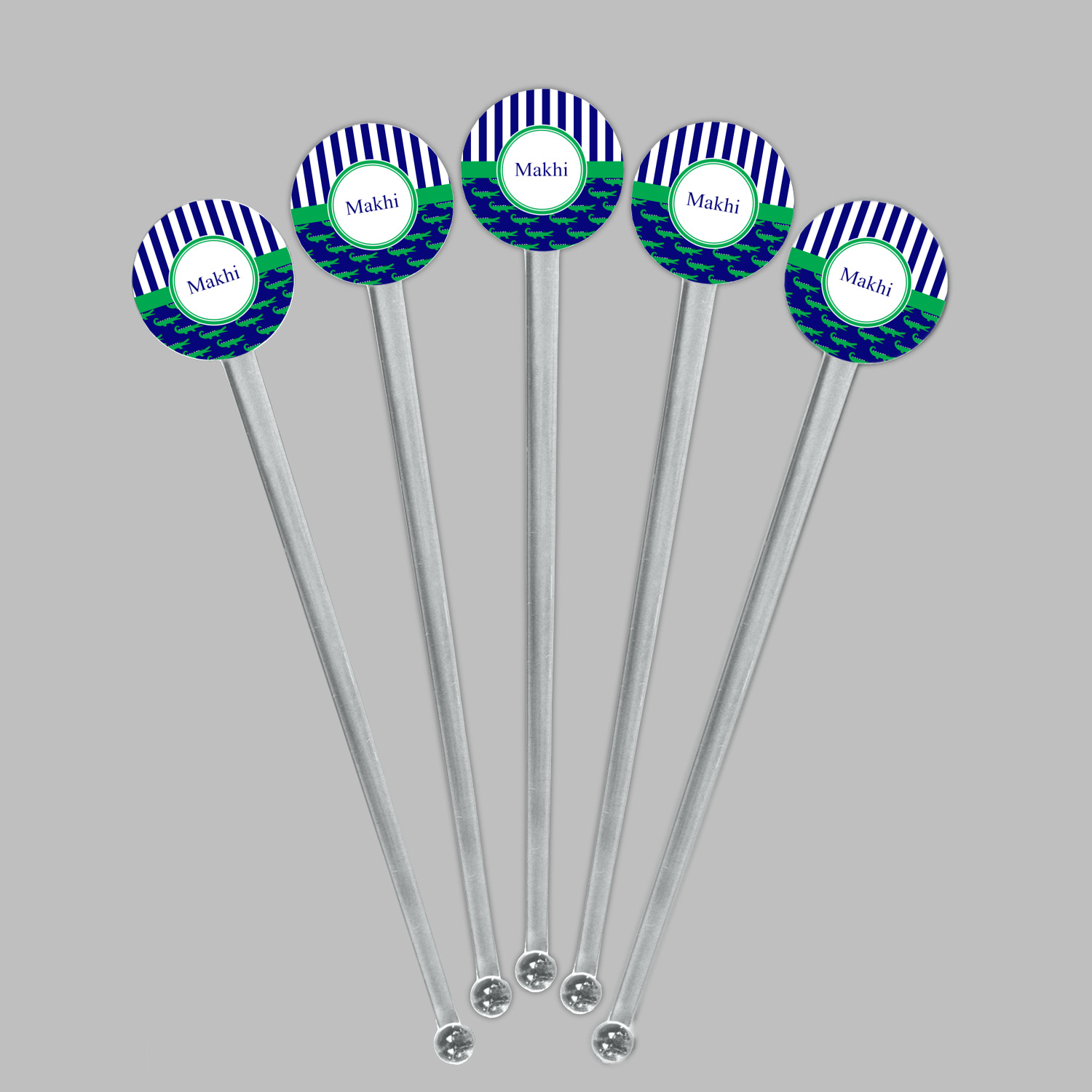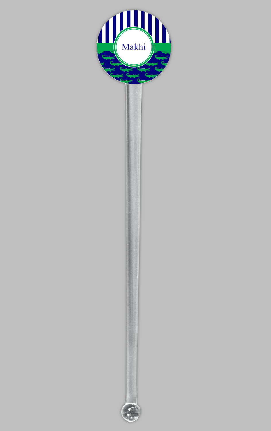 These are the sweetest alligators around! Our adorable green alligators pop and come alive on a blue background. To coordinate the alligator design a bold blue and white striped pattern is added to the top.