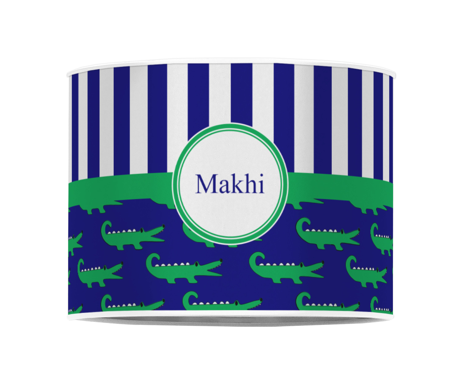 These are the sweetest alligators around! Our adorable green alligators pop and come alive on a blue background. To coordinate the alligator design a bold blue and white striped pattern is added to the top.