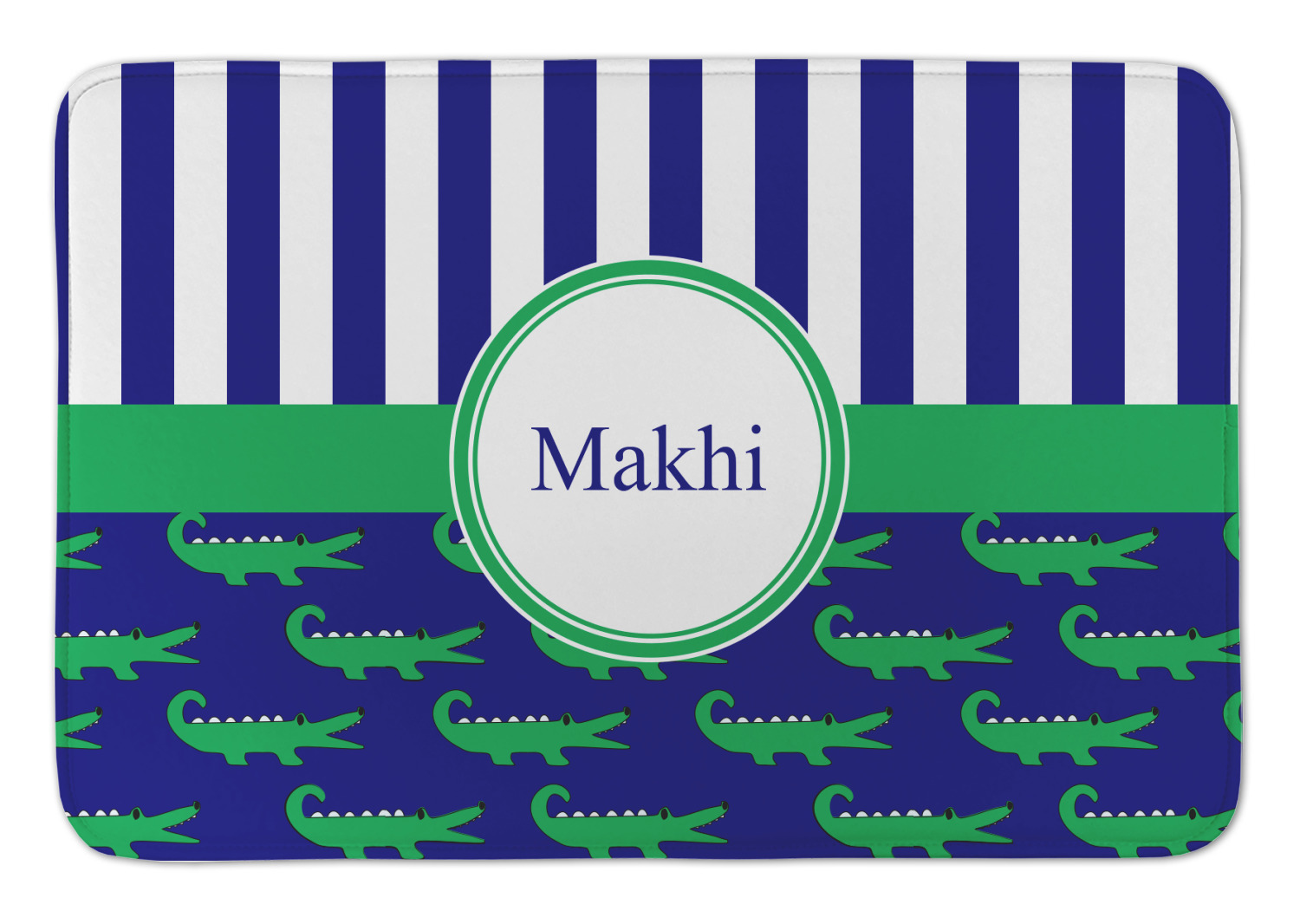 These are the sweetest alligators around! Our adorable green alligators pop and come alive on a blue background. To coordinate the alligator design a bold blue and white striped pattern is added to the top.