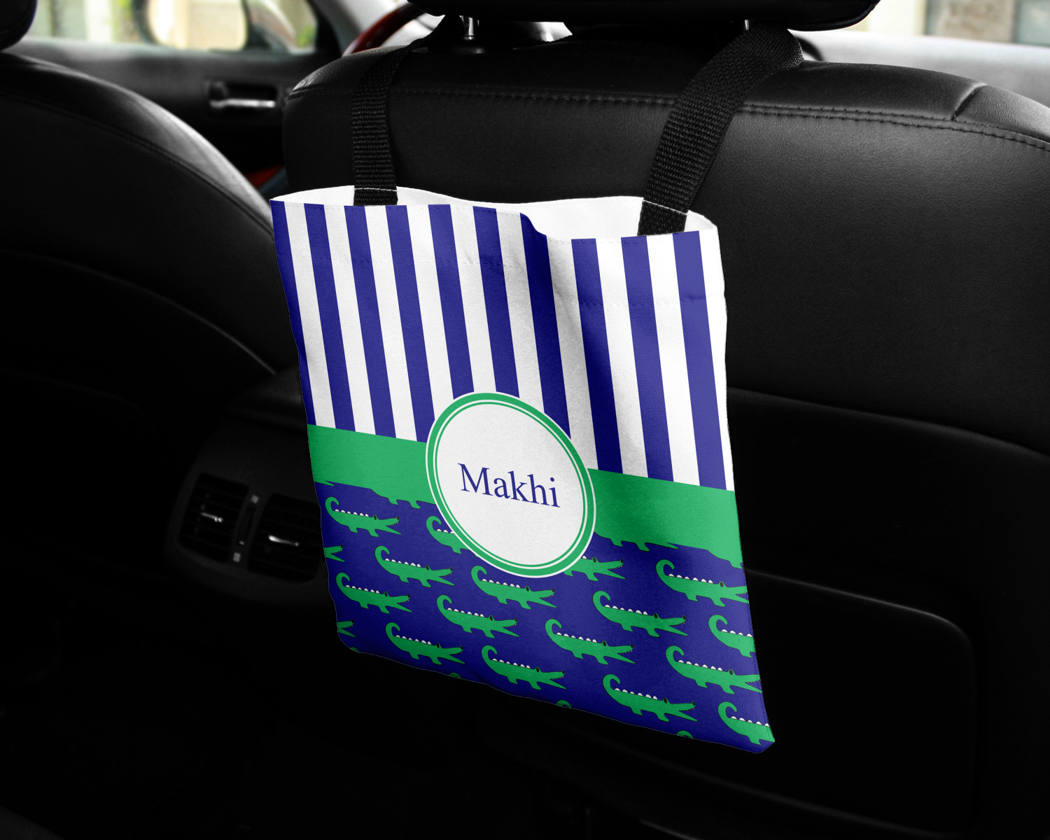 These car back seat organizers are sturdy tote-like bags, fabricated from a robust polyester, and features a single handle on the back side. The strap features an attachable velcro for easy attachment to headrests, grocery carts, car seats, and more. Simply undo the velcro, loop the strap around the headrest, reattach the velcro, and let the organizer hang from the front seat. These car organizers are the perfect means of increasing your backseat's legroom, while storing multiple items in one place for better accessibility. Each car back seat organizer measures at 10 by 10 inches, and features your personalized design printed across its front and back.