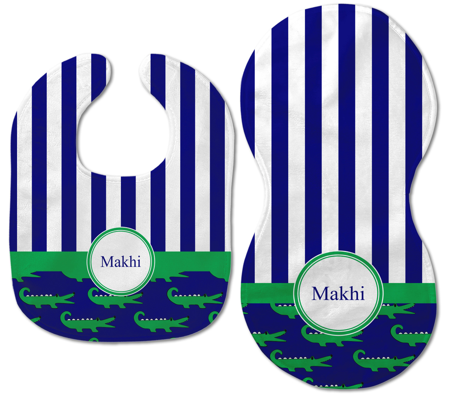 Both our baby bib and burp pad are made up of soft, microfiber velour with a cotton backing. The comfortable and plush material of our bib and burp set is perfect for both baby and parent. We print your design on the microfiber velour face fabric with baby safe ink on your customizable bib and burp cloth to ensure safety for the little one! Our drool bib also comes with a Velcro clasp for safe and easy wear while the burp cloth is a unique peanut shape that perfectly hugs over the shoulder.