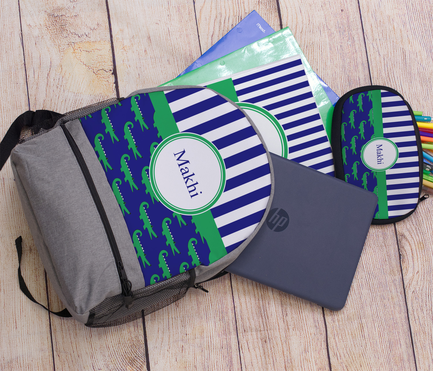 These are the sweetest alligators around! Our adorable green alligators pop and come alive on a blue background. To coordinate the alligator design a bold blue and white striped pattern is added to the top.