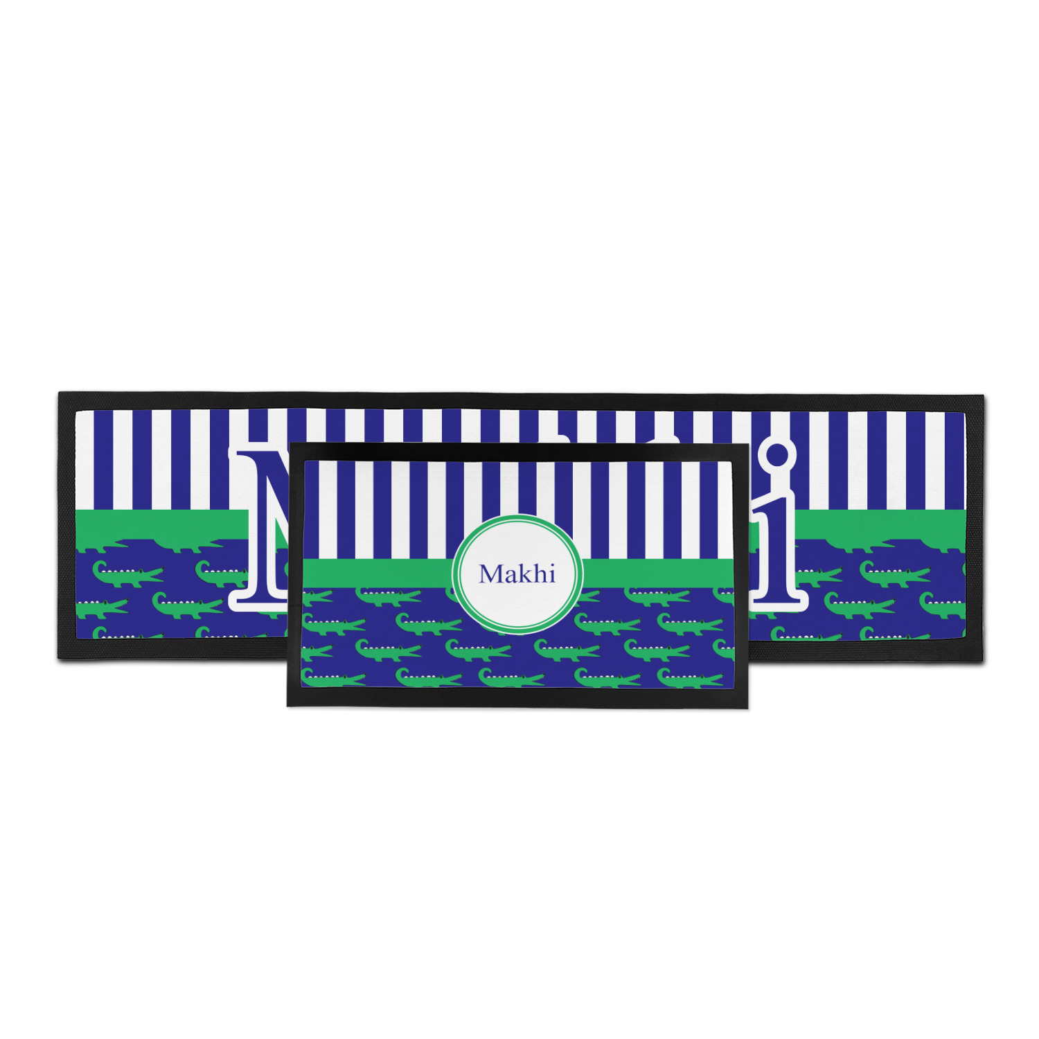 These are the sweetest alligators around! Our adorable green alligators pop and come alive on a blue background. To coordinate the alligator design a bold blue and white striped pattern is added to the top.