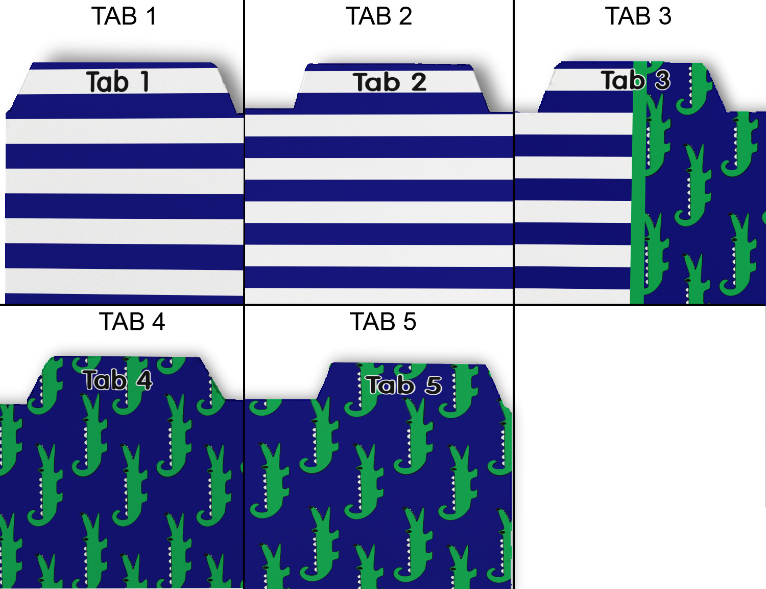 Whether you use binders at school or at work, we have designs to suit all of them. Available in 5 or 6 tab sets, you are sure to find a set to suit your needs. The back of each one is white and can be used to take notes, write vital information on, etc.