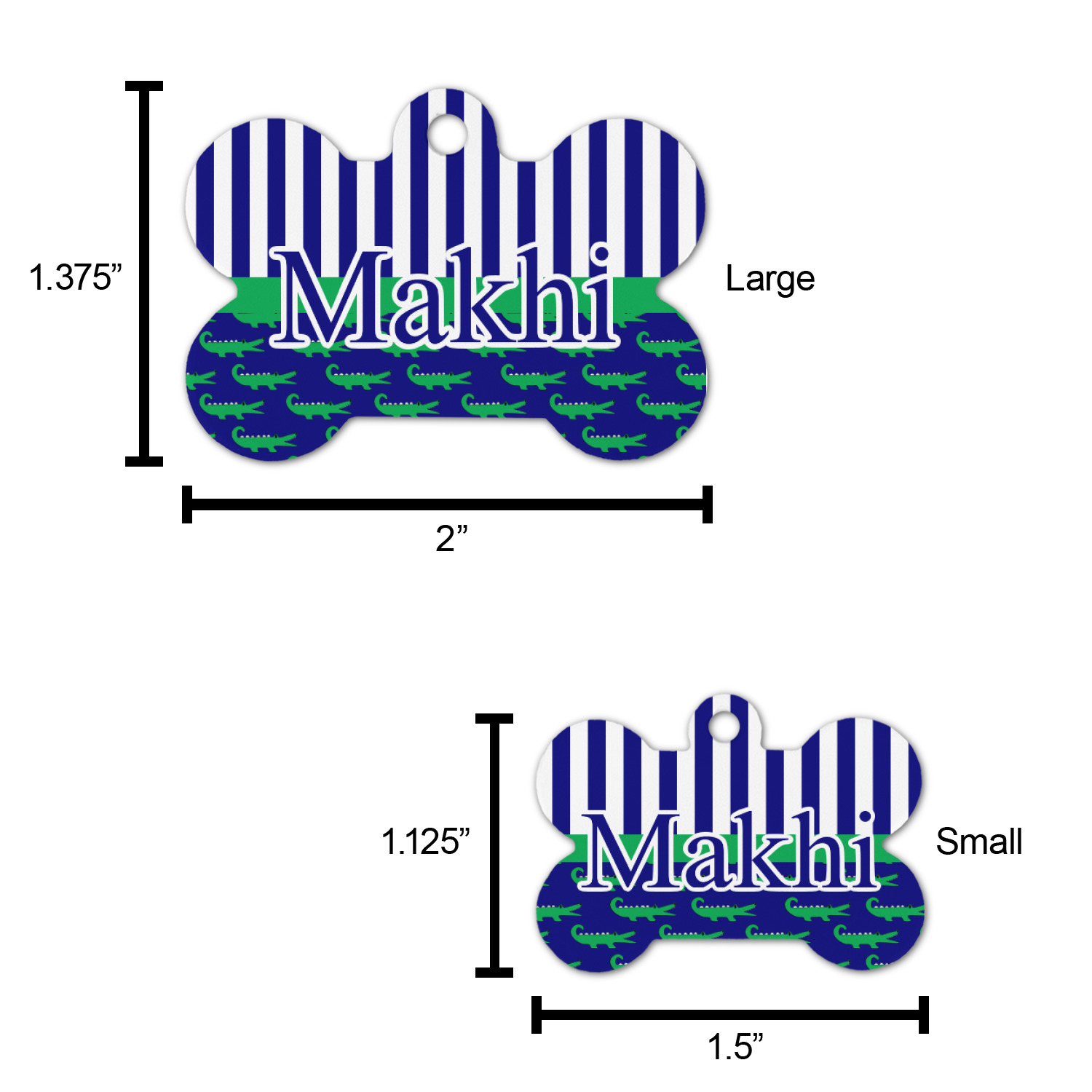 The small bone dog tag size is perfect to pair with our small dog collars, the large size pairs well with our large dog collars.