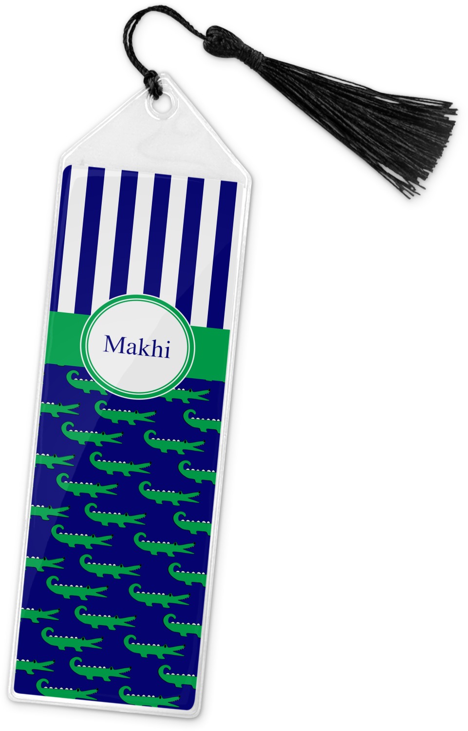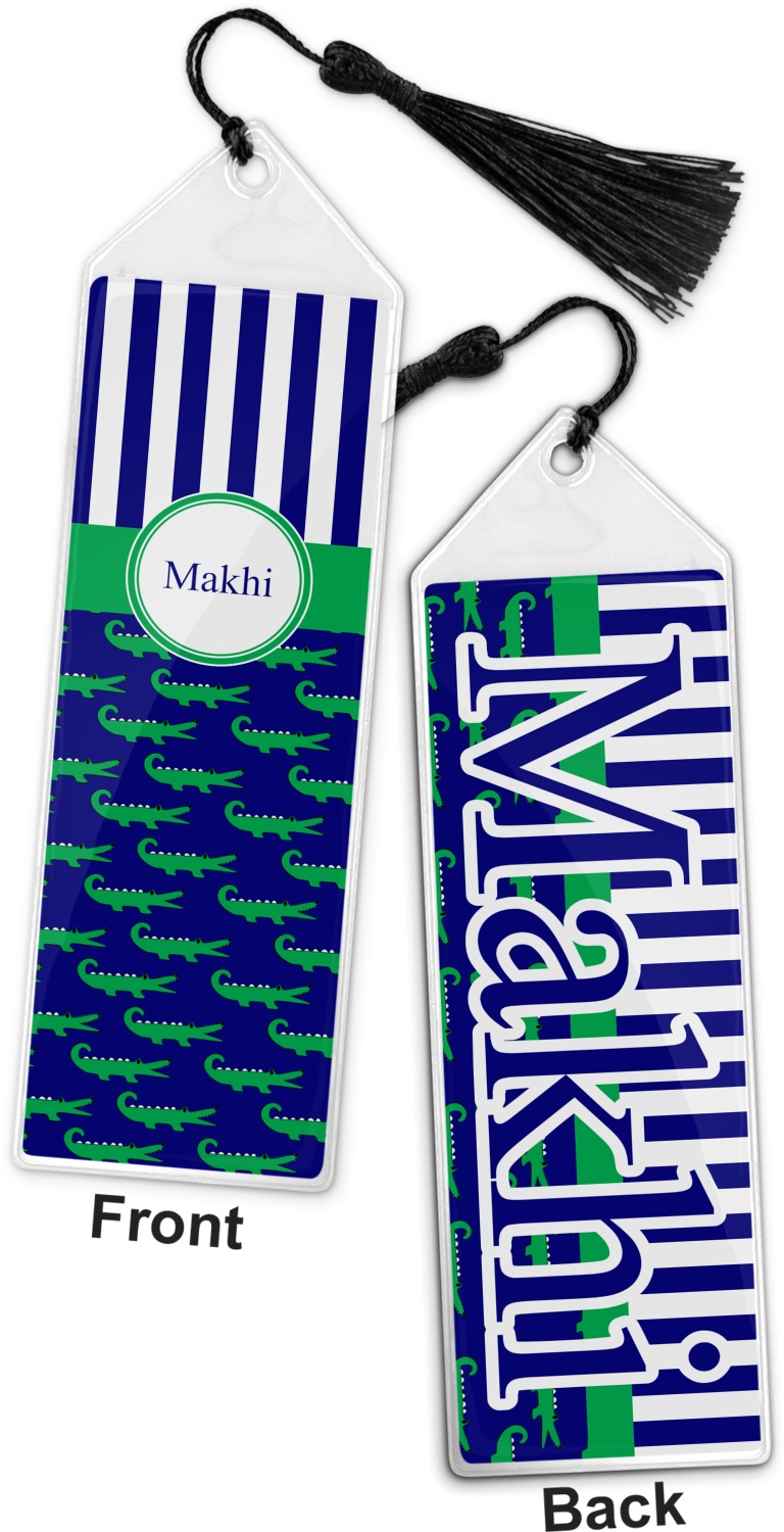 Your personalized bookmark is made of a sturdy, clear vinyl, and is approximately 7.5" x 2.25". We display your personalization on vinyl inserts that are placed on both sides. Accompanying each book marker is a black, fringe tassel that attaches to the reinforced, triangular header.