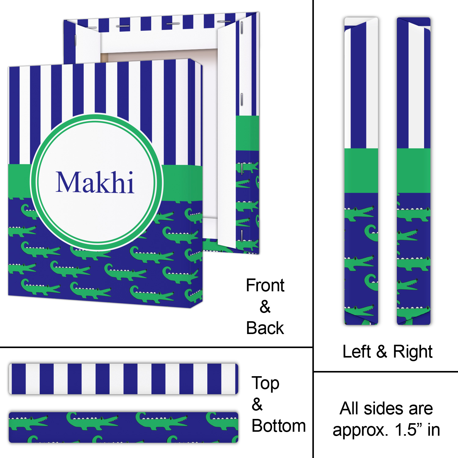 These are the sweetest alligators around! Our adorable green alligators pop and come alive on a blue background. To coordinate the alligator design a bold blue and white striped pattern is added to the top.