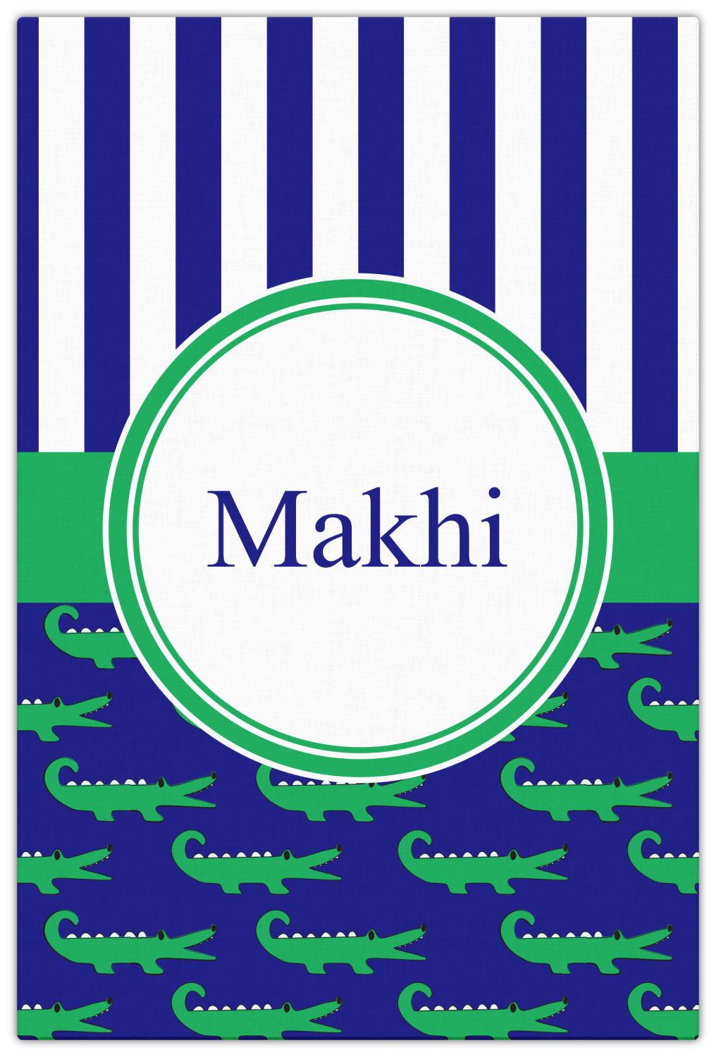 These are the sweetest alligators around! Our adorable green alligators pop and come alive on a blue background. To coordinate the alligator design a bold blue and white striped pattern is added to the top.