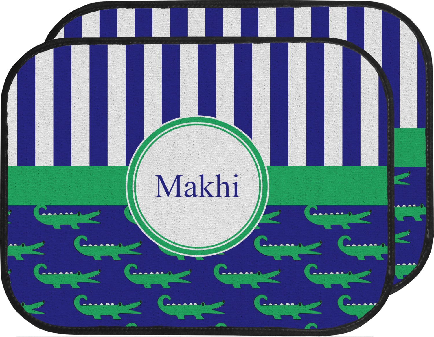 These are the sweetest alligators around! Our adorable green alligators pop and come alive on a blue background. To coordinate the alligator design a bold blue and white striped pattern is added to the top.