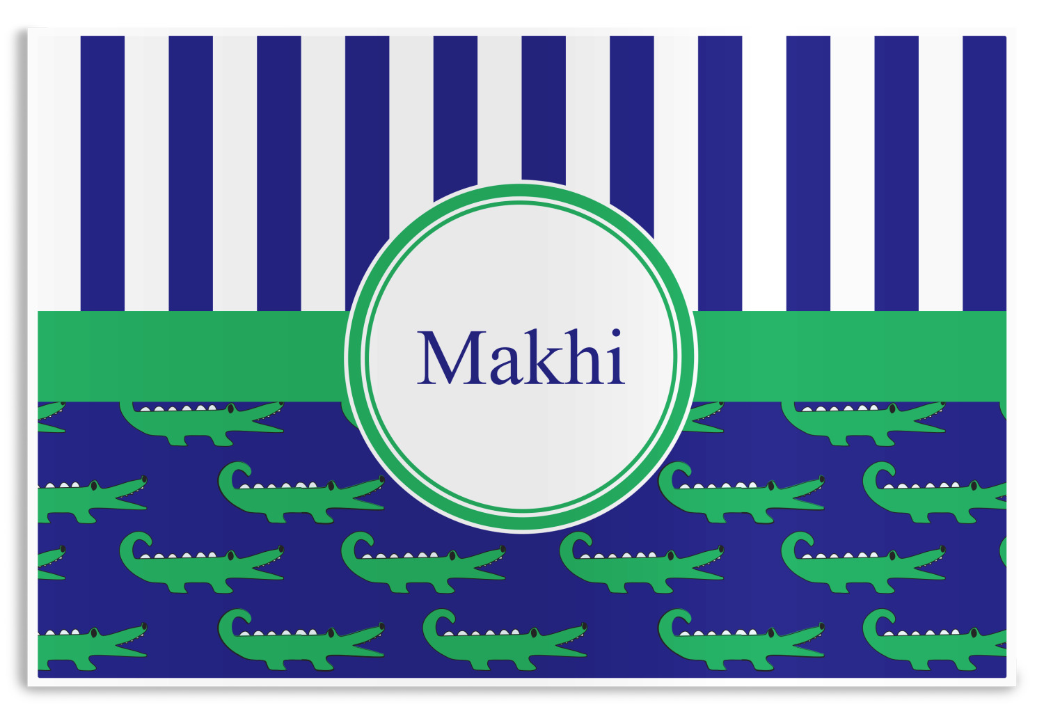 These are the sweetest alligators around! Our adorable green alligators pop and come alive on a blue background. To coordinate the alligator design a bold blue and white striped pattern is added to the top.