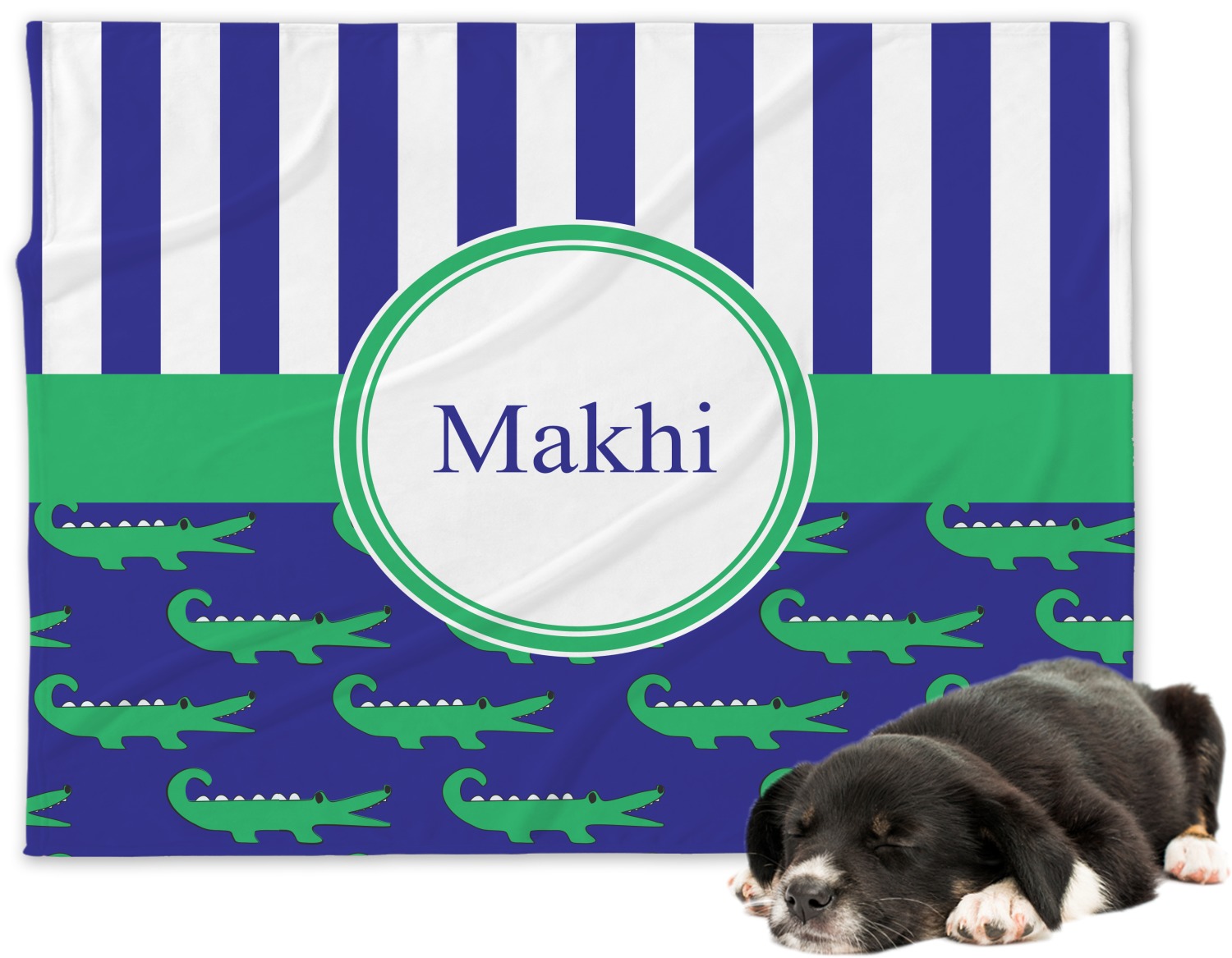 These are the sweetest alligators around! Our adorable green alligators pop and come alive on a blue background. To coordinate the alligator design a bold blue and white striped pattern is added to the top.