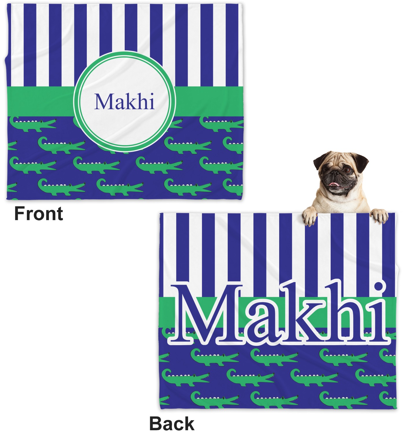 These dog blankets are crafted from a gentle, soft-to-the-touch, minky material. We print your customizations, either matching or differing, on both the top and underside of the blanket. These personalized dog blankets are available in two sizes: regular and large. Our regular size, at 40" x 30", accommodates small and some medium size dogs. At 60" x 50", our large dog blanket is a better fit for bigger breeds. Though specialized for dogs, these blankets still make a thoughtful gift for your favorite feline, or any other pet in mind!
