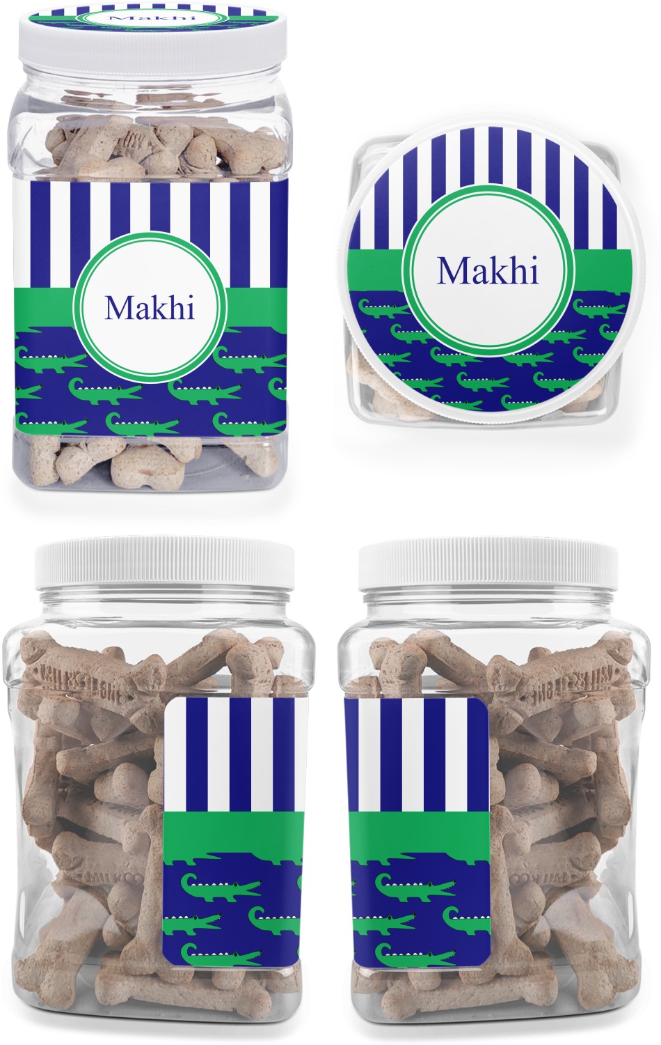 This half gallon jar, made from a sturdy plastic, is the perfect way to keep treats from any naughty pet paws, while still keeping them ready on hand for when your pup performs an impressive trick. This dog cookie jar features a screw-on, white lid that displays your personalized design on a vinyl sticker. We apply another customized sticker that wraps around the front and sides of the jar. Our dog treat jar also has indentations on the rear ends of the sides, which allows for convenient handling, and its square frame allows for easy storage.