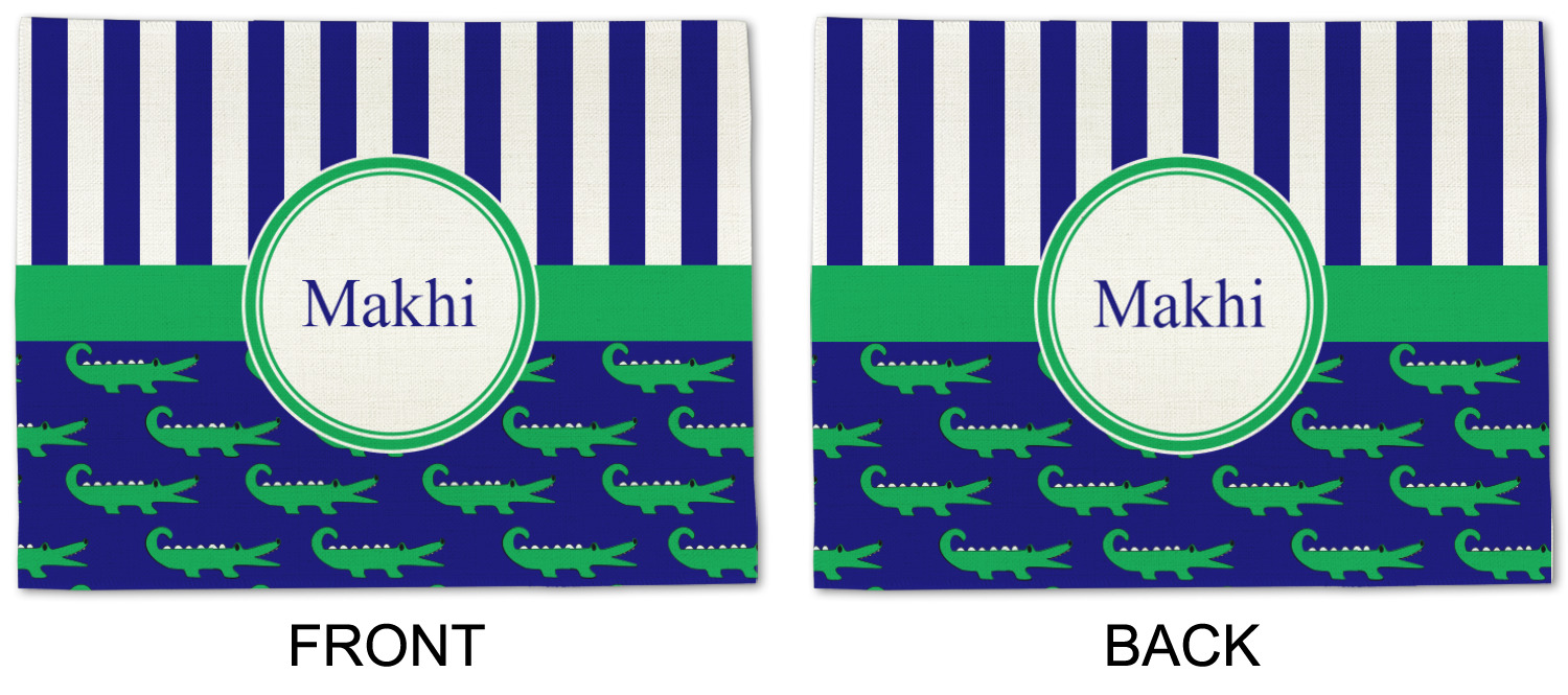 These are the sweetest alligators around! Our adorable green alligators pop and come alive on a blue background. To coordinate the alligator design a bold blue and white striped pattern is added to the top.