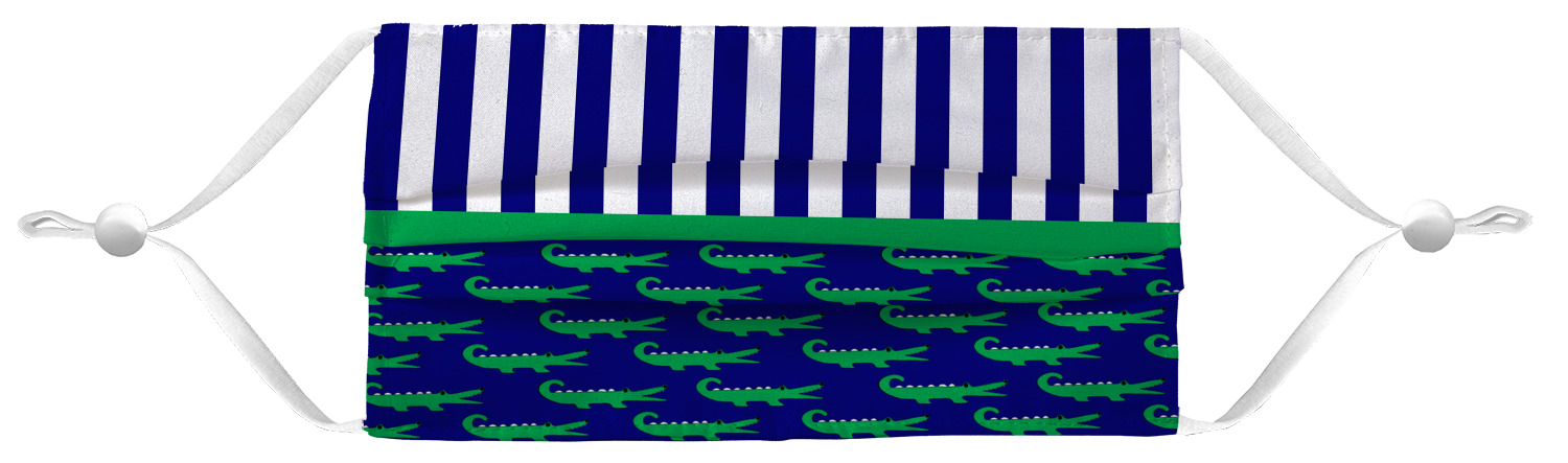 These are the sweetest alligators around! Our adorable green alligators pop and come alive on a blue background. To coordinate the alligator design a bold blue and white striped pattern is added to the top.