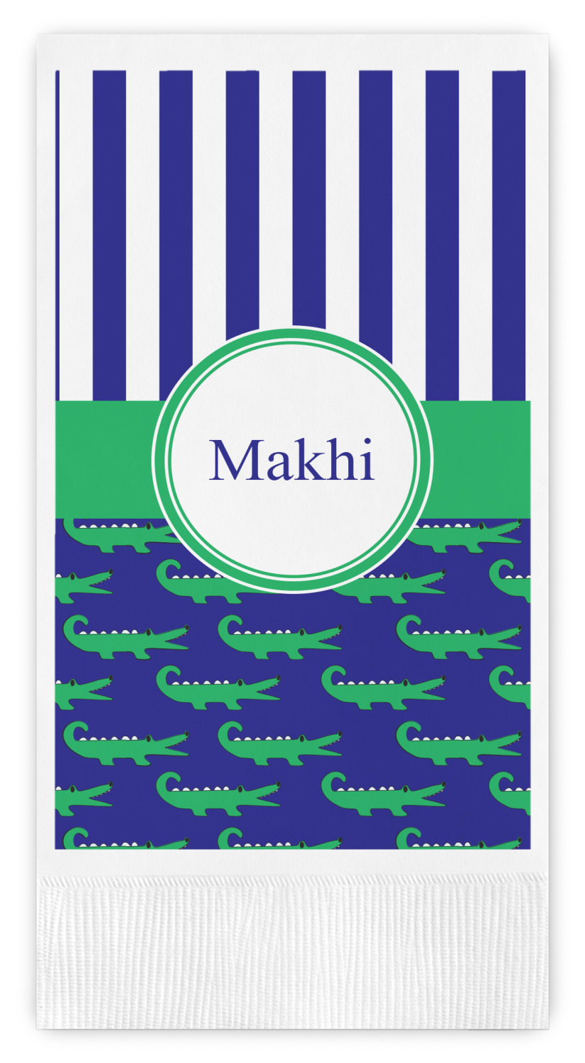 These are the sweetest alligators around! Our adorable green alligators pop and come alive on a blue background. To coordinate the alligator design a bold blue and white striped pattern is added to the top.