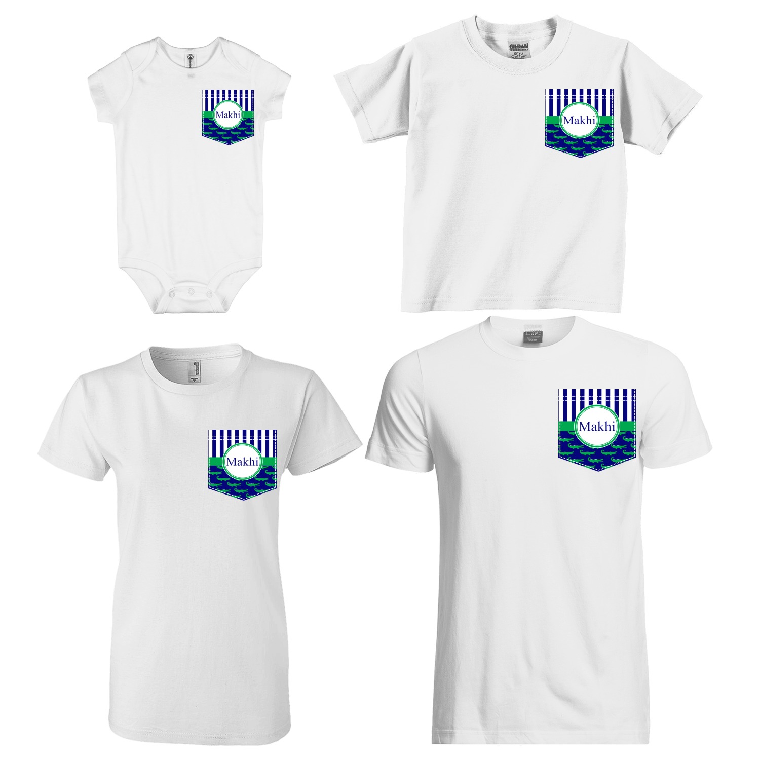 The faux pockets are available in 4 different sizes - for baby, kids, youth/women & men; the whole family can have the same pocket design, but sized just for them! The pockets are printed using our direct-to-film technology to the exact shape & size. We have faux stitching around the pocket, with double stitching on the top of the pocket to give it the authentic pocket look!