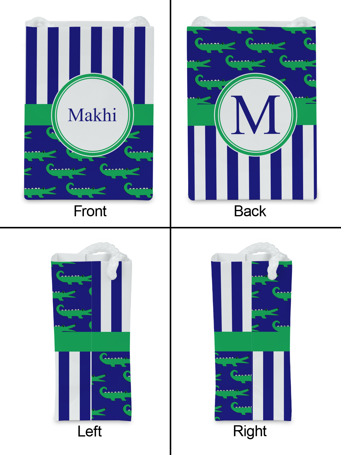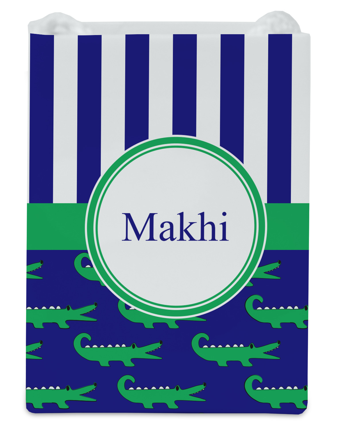 These are the sweetest alligators around! Our adorable green alligators pop and come alive on a blue background. To coordinate the alligator design a bold blue and white striped pattern is added to the top.
