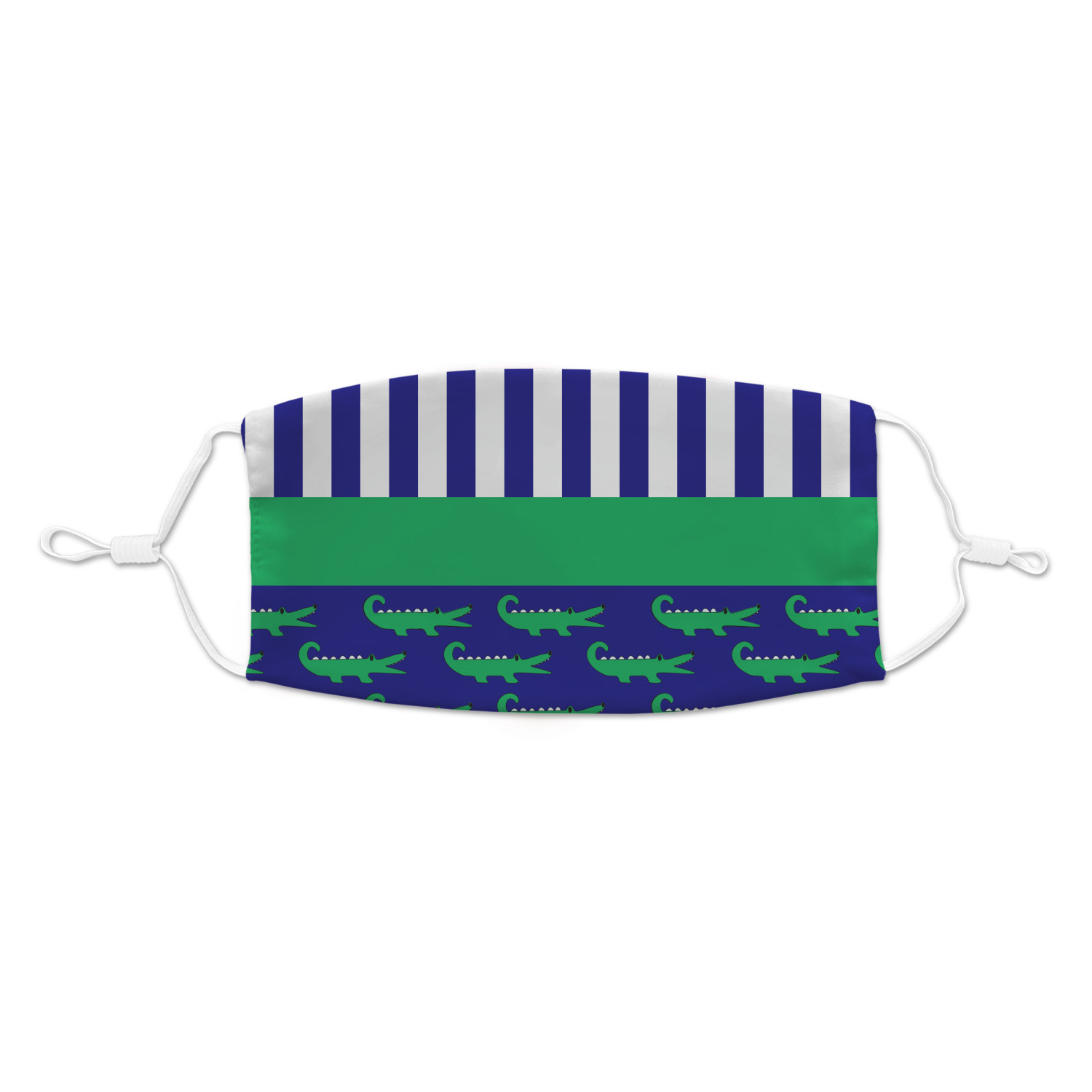 These are the sweetest alligators around! Our adorable green alligators pop and come alive on a blue background. To coordinate the alligator design a bold blue and white striped pattern is added to the top.