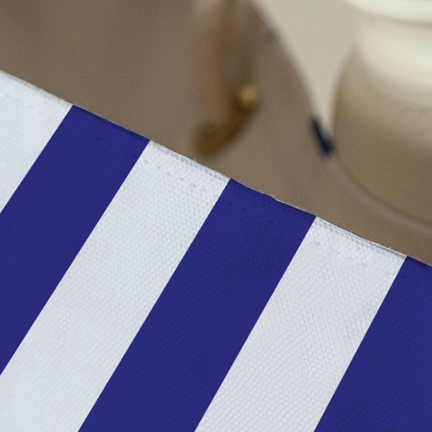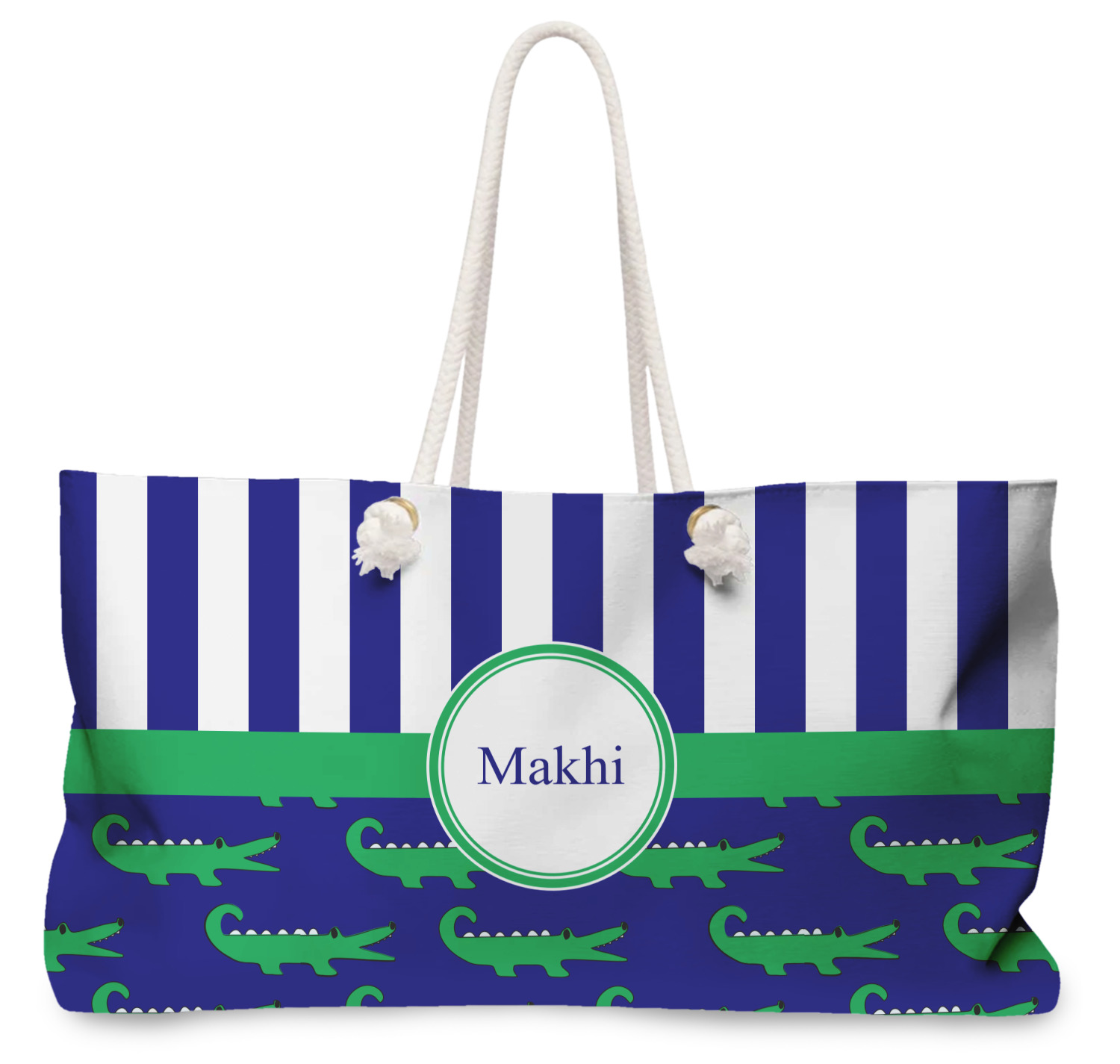 Our oversized weekender tote with rope handles is perfect for your weekend at the beach or on the town. This large tote are 24" W X 13" H, with a 5" gusset and a 27" thick rope handles with a knot that is put through a grommeted brass hole.