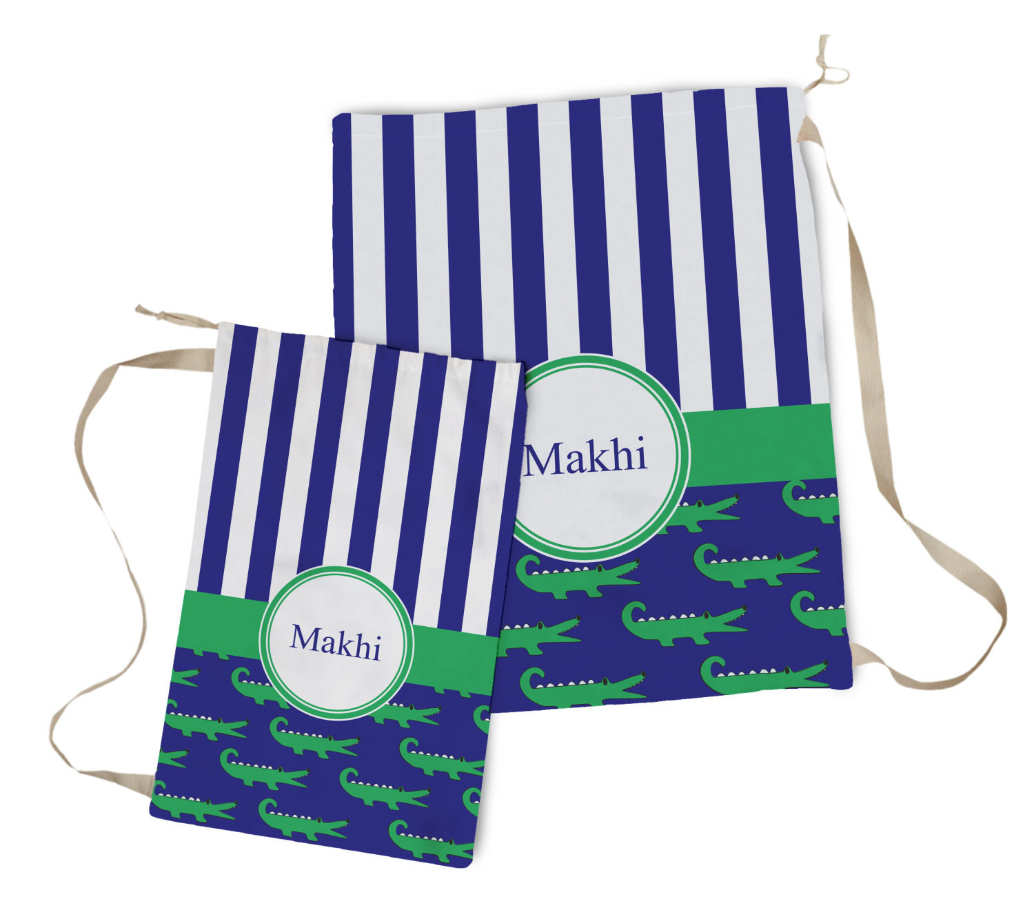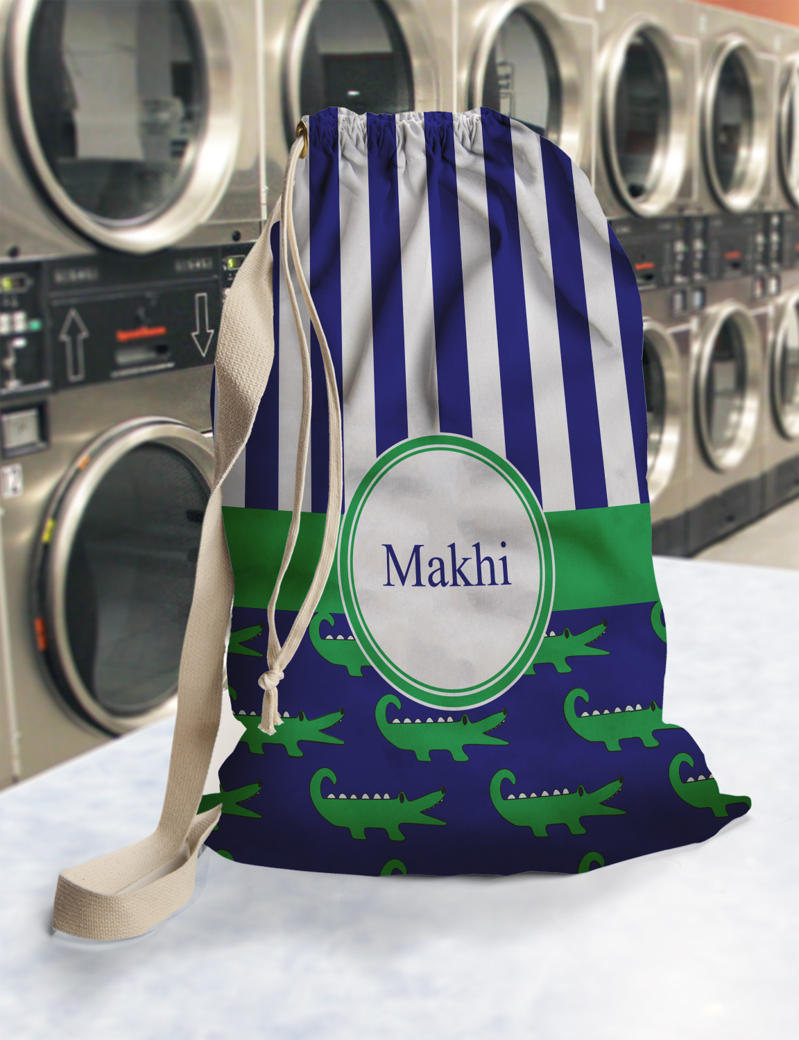 Carry your laundry in style with these customized laundry bags. Available in two sizes, featuring a natural colored woven strap and a cinch cord, these bags hold a lot of clothes or anything else you want to fit in them.