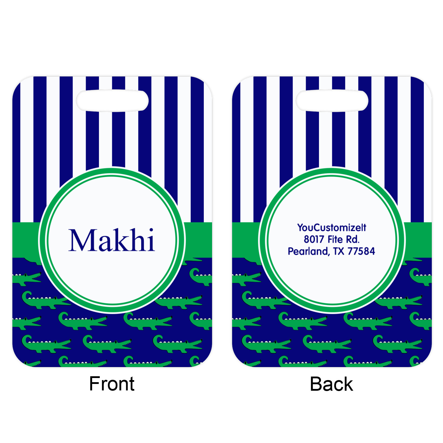 These metal luggage tags are printed on both sides; the front is printed with the design of your choice - and can be personalized with your name, name & initial or your monogram. The back can have as much or as little of your contact information as you desire - your name, your address, city, zip & state, you can also include your phone number and email address. Customize it exactly the way you want it!