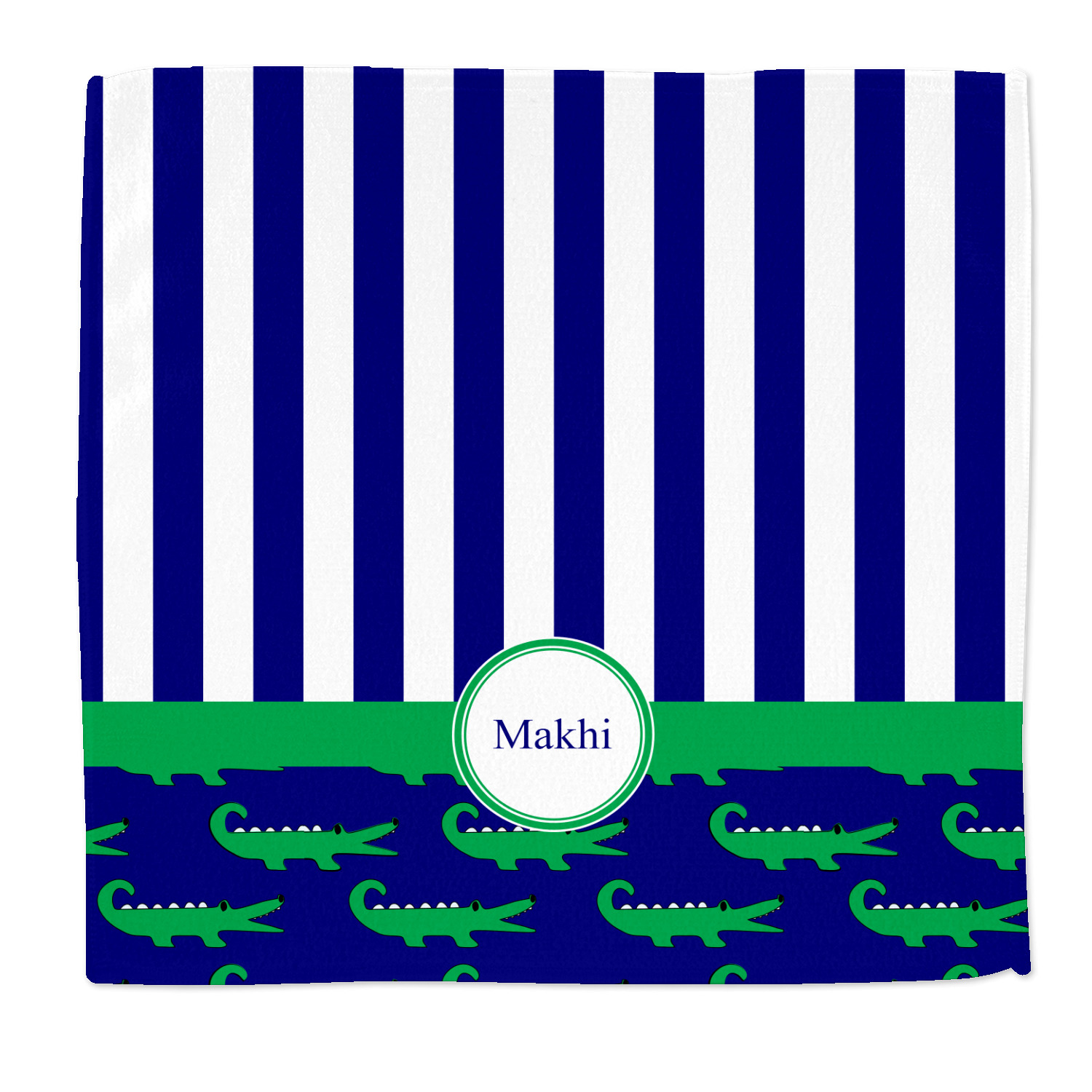 These are the sweetest alligators around! Our adorable green alligators pop and come alive on a blue background. To coordinate the alligator design a bold blue and white striped pattern is added to the top.