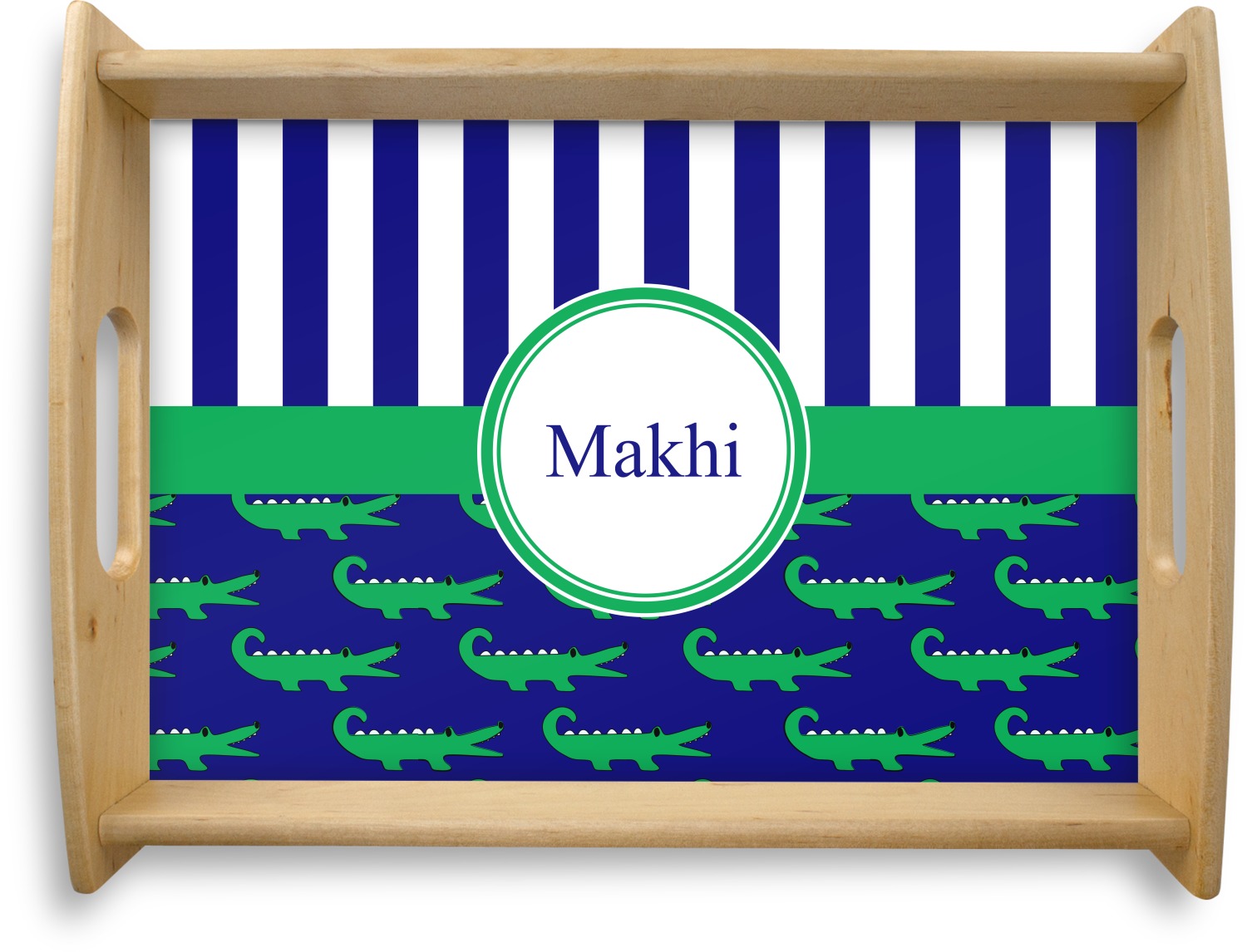 This serving tray with handles features square edges and two rounded sides, creating a very modern look. Each side is fabricated from a beautifully cut, natural wood. The bottom of the interior of the tray displays your customized design in bright, vibrant color. The tray is sold in both a black color and a natural wood look. Each variation of the wood serving tray has two sizes: Small, which is 14" x 10" x 2.25", and Large, which is 19.5" x 13.5" x 2.75".
