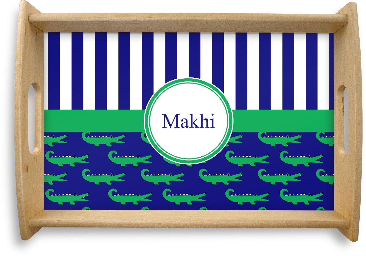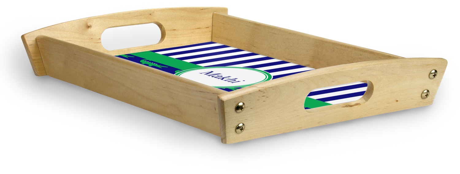 This serving tray with handles features square edges and two rounded sides, creating a very modern look. Each side is fabricated from a beautifully cut, natural wood. The bottom of the interior of the tray displays your customized design in bright, vibrant color. The tray is sold in both a black color and a natural wood look. Each variation of the wood serving tray has two sizes: Small, which is 14" x 10" x 2.25", and Large, which is 19.5" x 13.5" x 2.75".