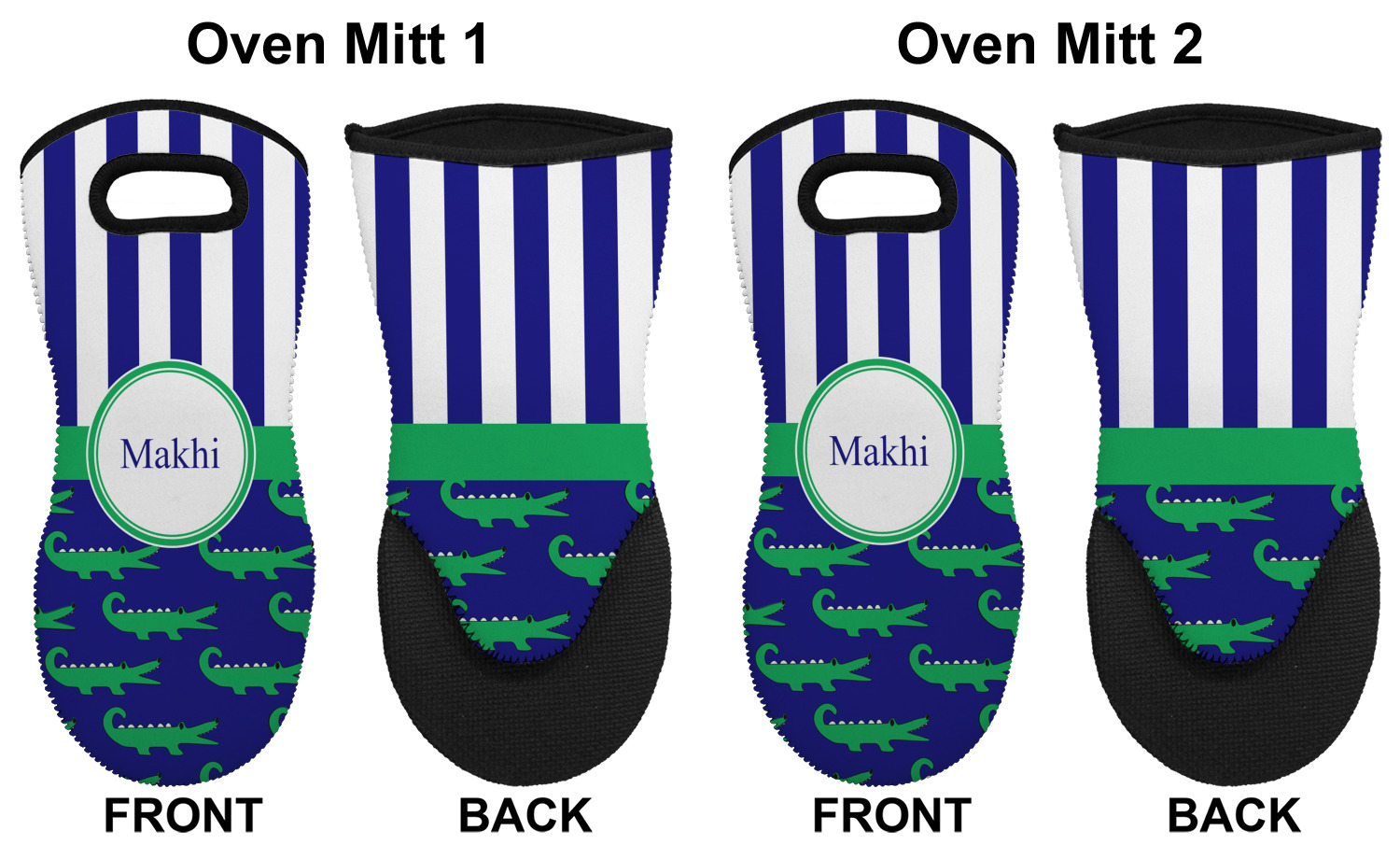 These heat resistant gloves are made entirely of a durable neoprene; the front features a softer texture, while the palm's side has a textured surface, meant to handle heat up to 500 degrees Fahrenheit. Thick, heavy duty stitching connects the two sides. A small, oval cutout appears on the front, and can be used to hang and store the mitt. Your personalization appears on the front, and the upper part of the back of the mitt. The style of these oven mitts are suitable for both the right and left hand, depending on your needs. If you need one for each hand, be sure to order two!