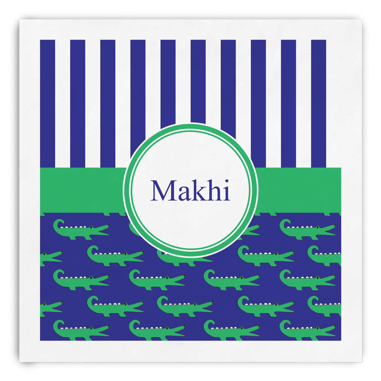 These are the sweetest alligators around! Our adorable green alligators pop and come alive on a blue background. To coordinate the alligator design a bold blue and white striped pattern is added to the top.