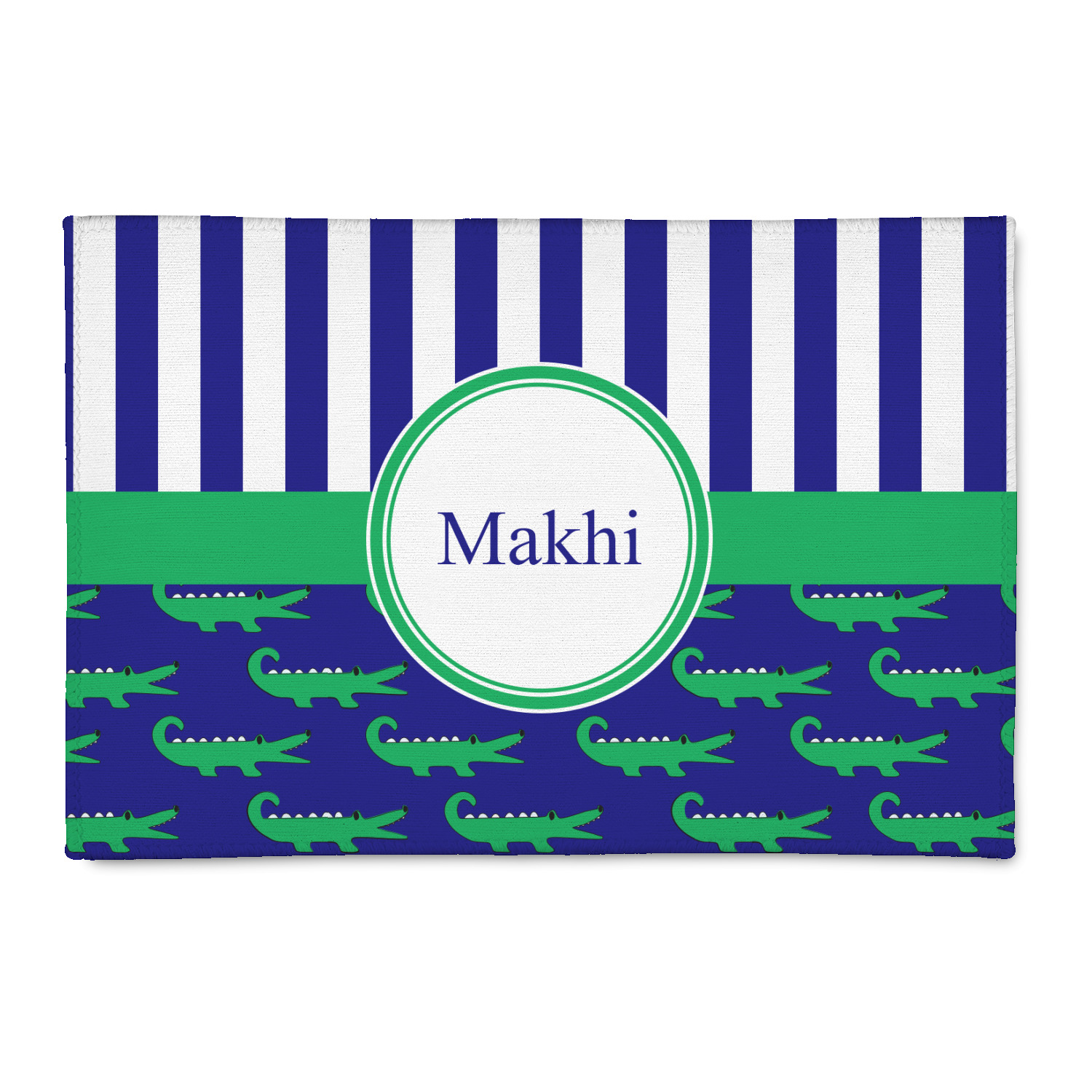 These are the sweetest alligators around! Our adorable green alligators pop and come alive on a blue background. To coordinate the alligator design a bold blue and white striped pattern is added to the top.