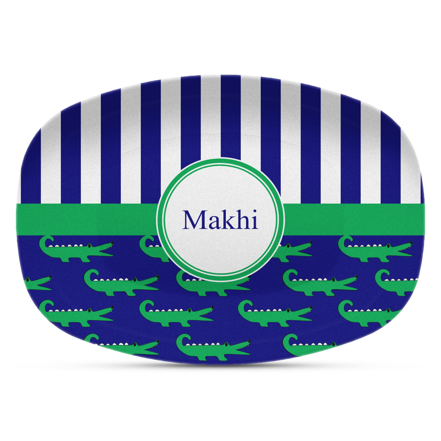 These serving platters are made from a composite, thermo-set, polymer plastic that gives it the versatility, durability, and weight of a melamine platter, without any of the downsides of melamine. These personalized platters, can withstand temperatures up to 250 degrees Fahrenheit, for up to 60 minutes. No harmful chemicals, such as BPA, formaldehyde, and DEHPs were used in the manufacturing of this product. This large serving platter measures at 14" x 10.25", and is spacious enough to hold any of your appetizers or bite-sized desserts. The platter exhibits your personalization across the entirety of its front.