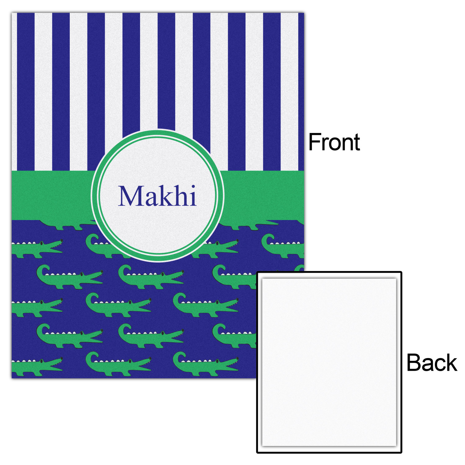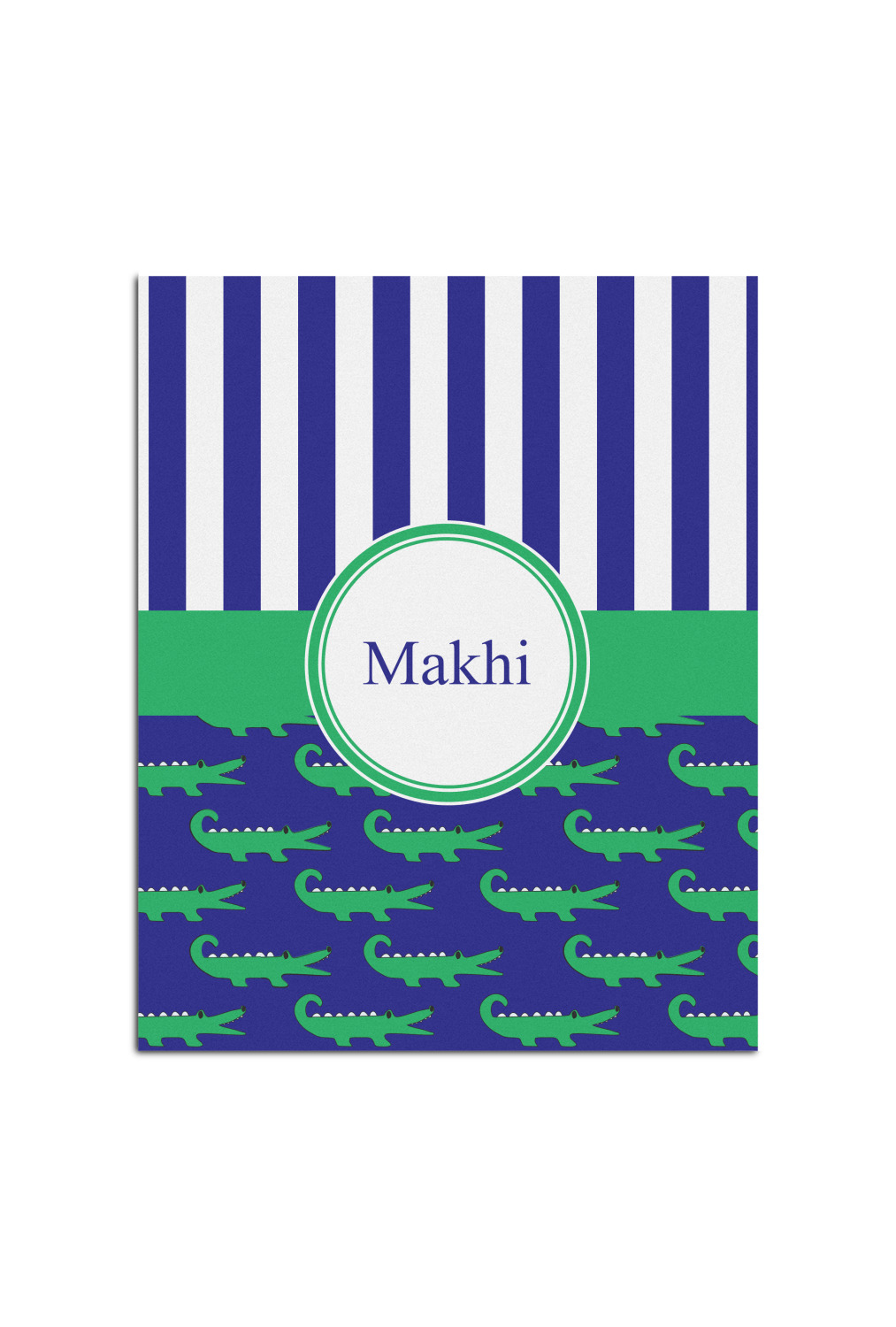 These are the sweetest alligators around! Our adorable green alligators pop and come alive on a blue background. To coordinate the alligator design a bold blue and white striped pattern is added to the top.