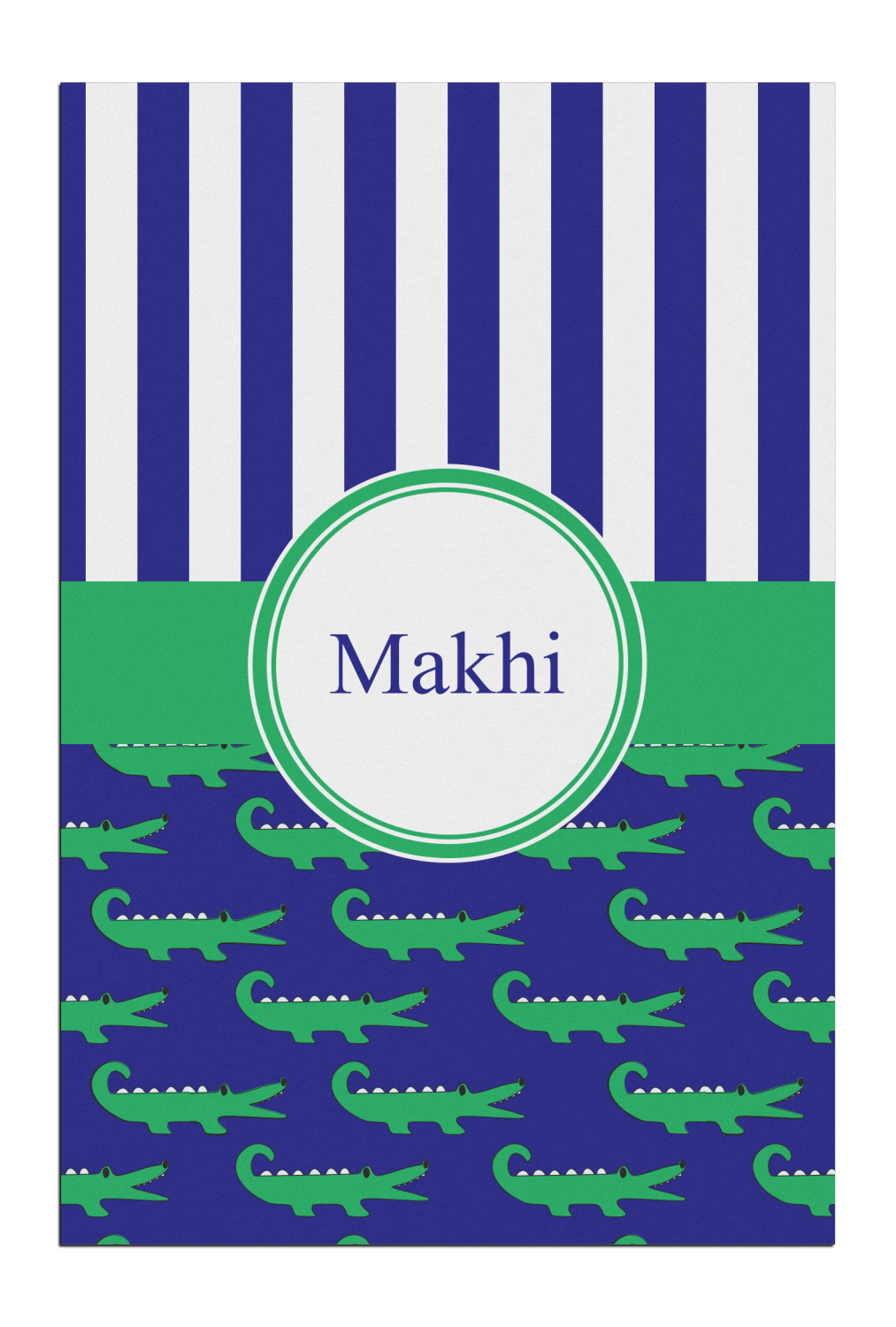 These are the sweetest alligators around! Our adorable green alligators pop and come alive on a blue background. To coordinate the alligator design a bold blue and white striped pattern is added to the top.