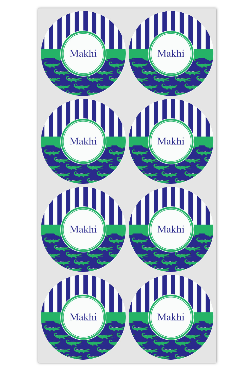 These are the sweetest alligators around! Our adorable green alligators pop and come alive on a blue background. To coordinate the alligator design a bold blue and white striped pattern is added to the top.