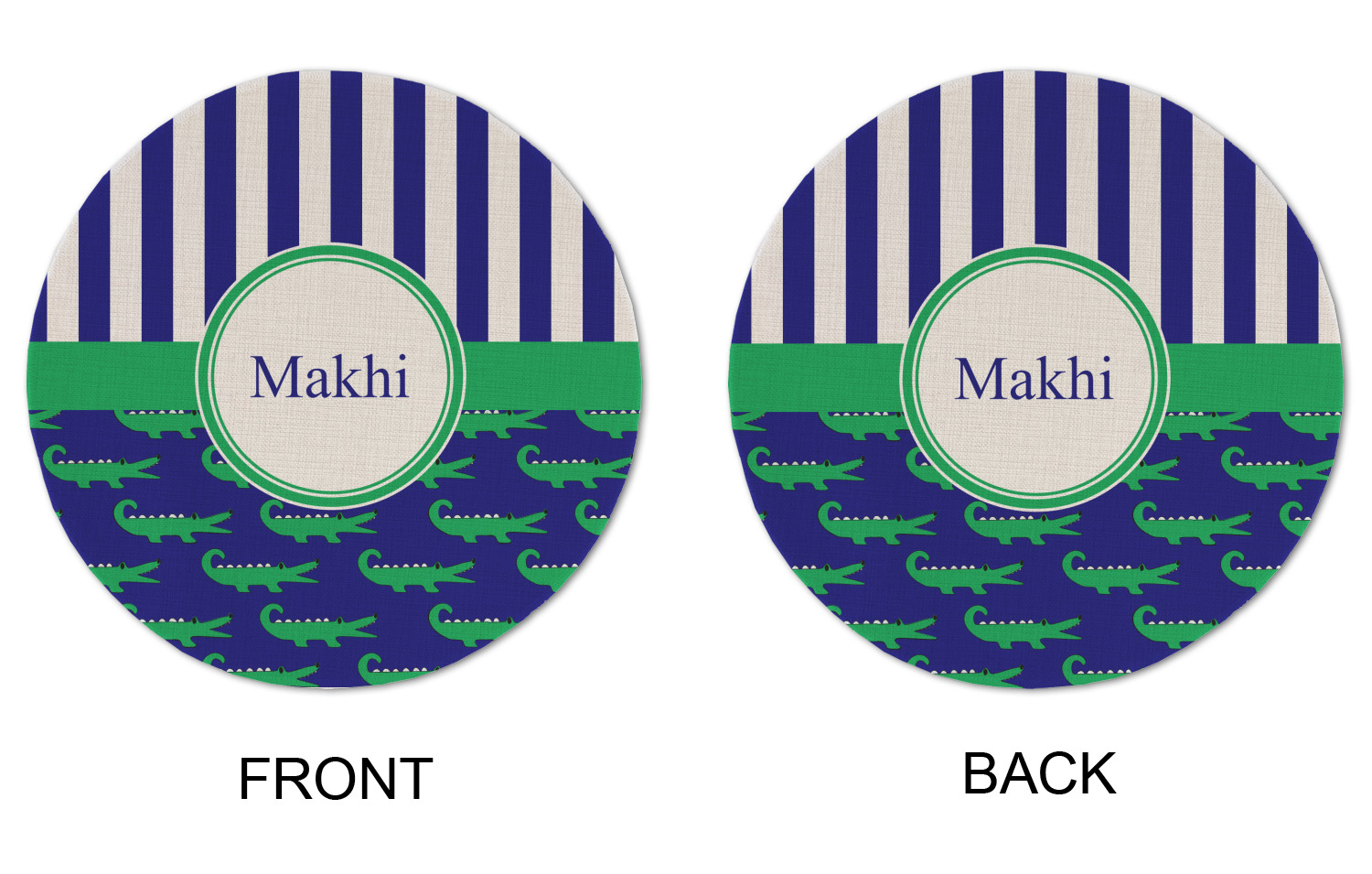 These are the sweetest alligators around! Our adorable green alligators pop and come alive on a blue background. To coordinate the alligator design a bold blue and white striped pattern is added to the top.