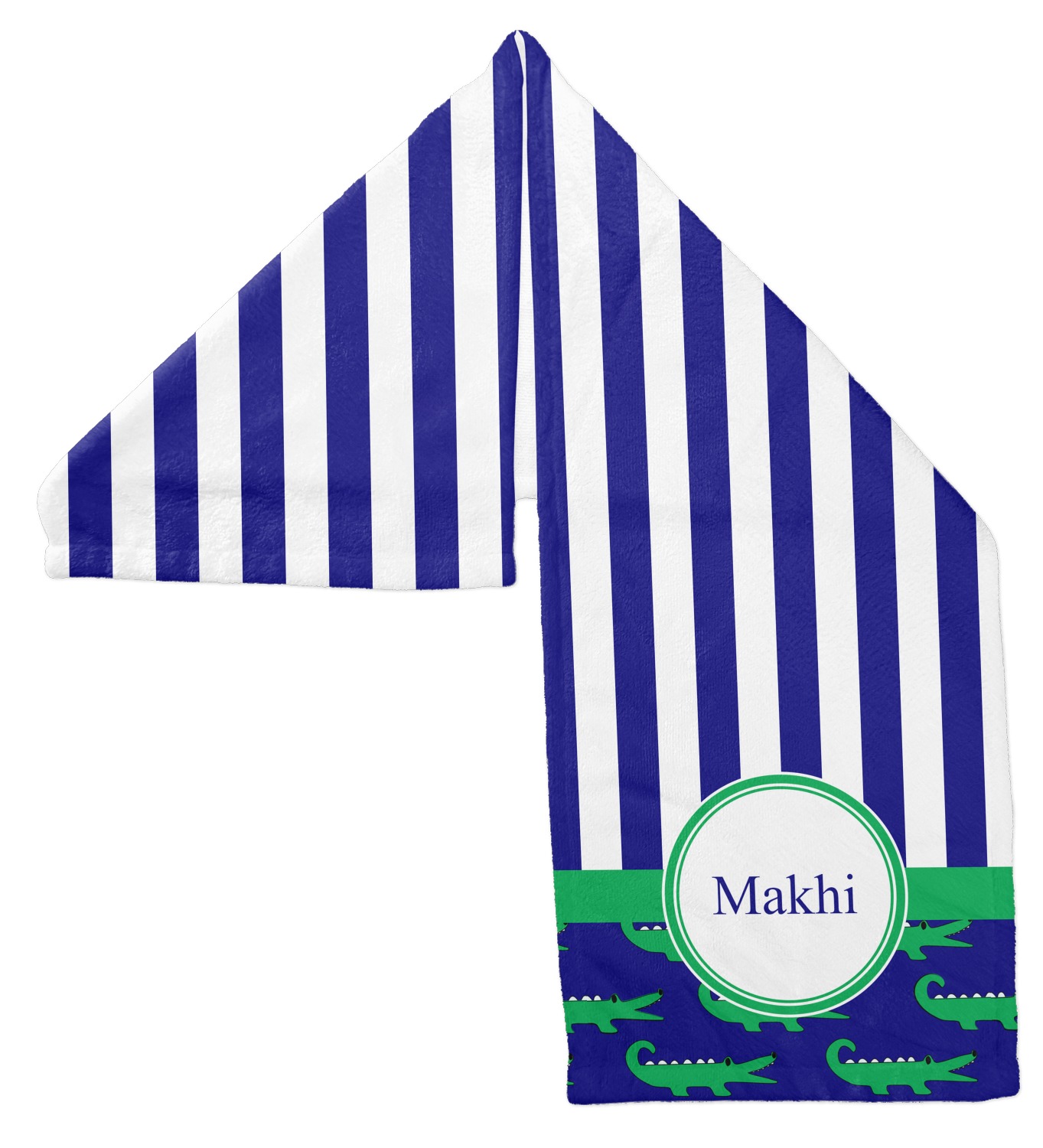 These are the sweetest alligators around! Our adorable green alligators pop and come alive on a blue background. To coordinate the alligator design a bold blue and white striped pattern is added to the top.