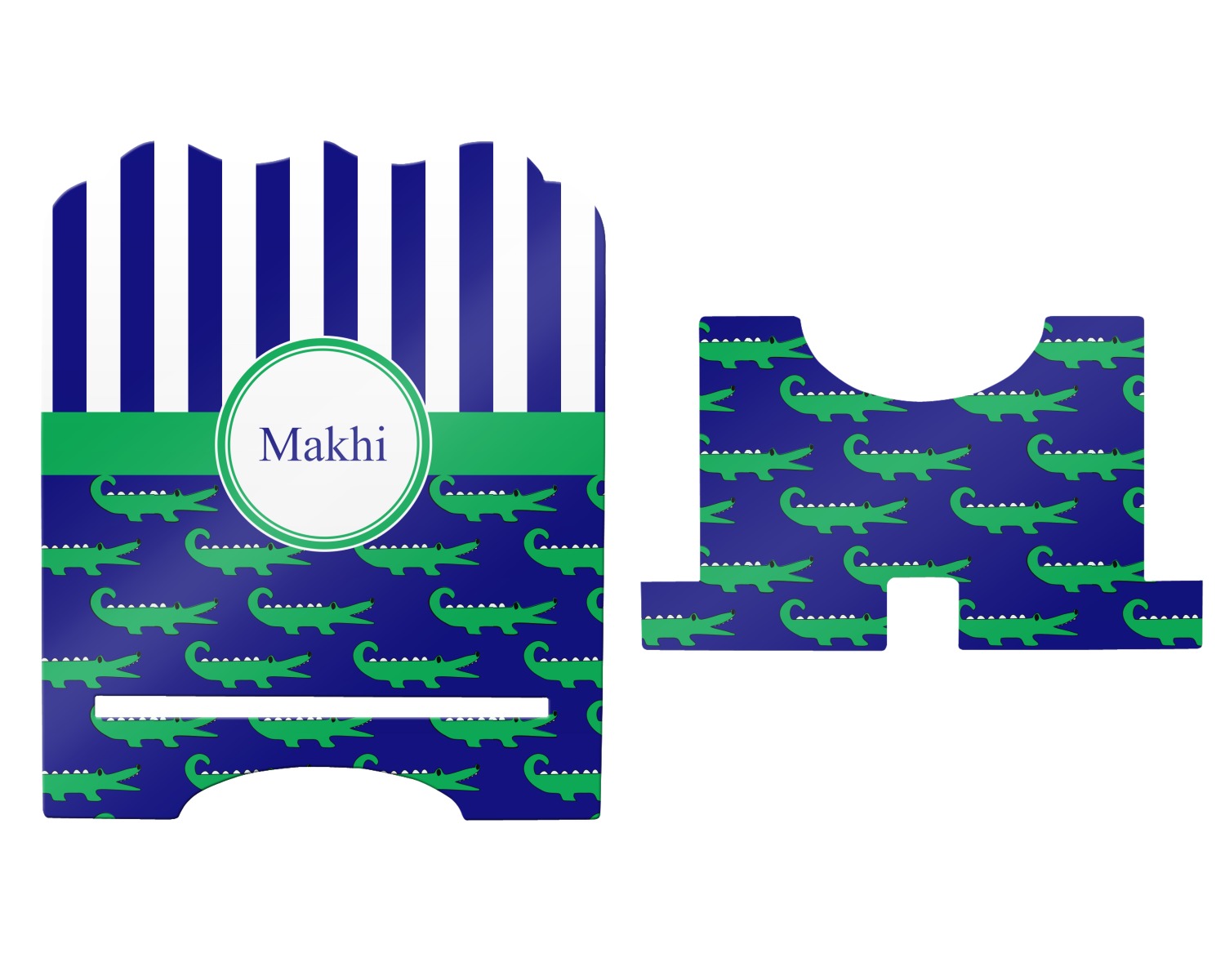 These are the sweetest alligators around! Our adorable green alligators pop and come alive on a blue background. To coordinate the alligator design a bold blue and white striped pattern is added to the top.