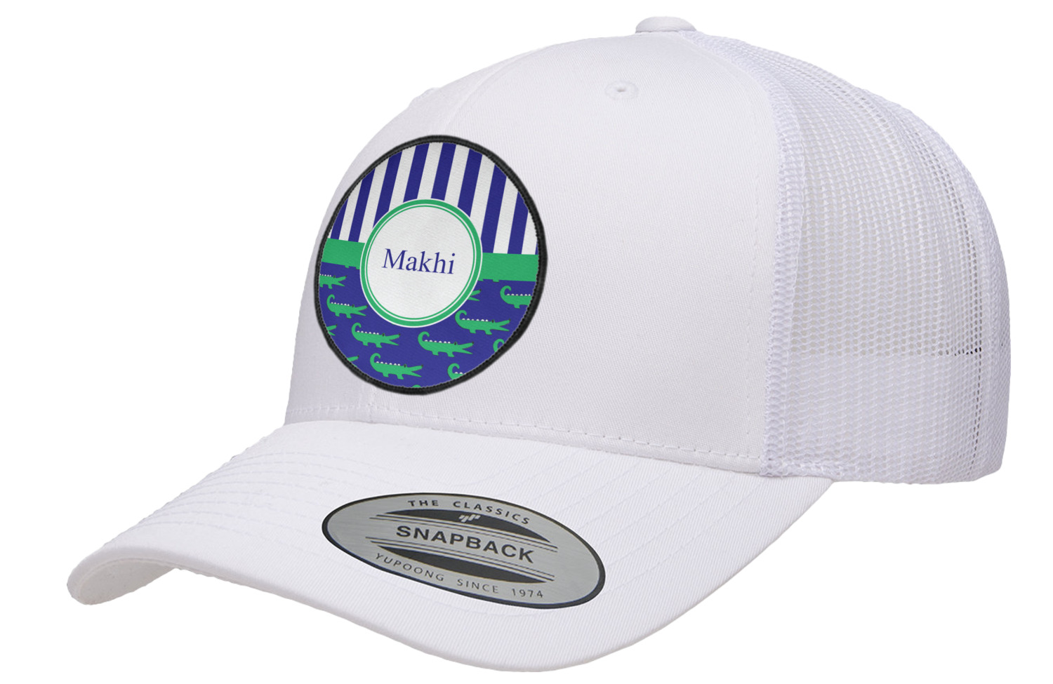 These are the sweetest alligators around! Our adorable green alligators pop and come alive on a blue background. To coordinate the alligator design a bold blue and white striped pattern is added to the top.