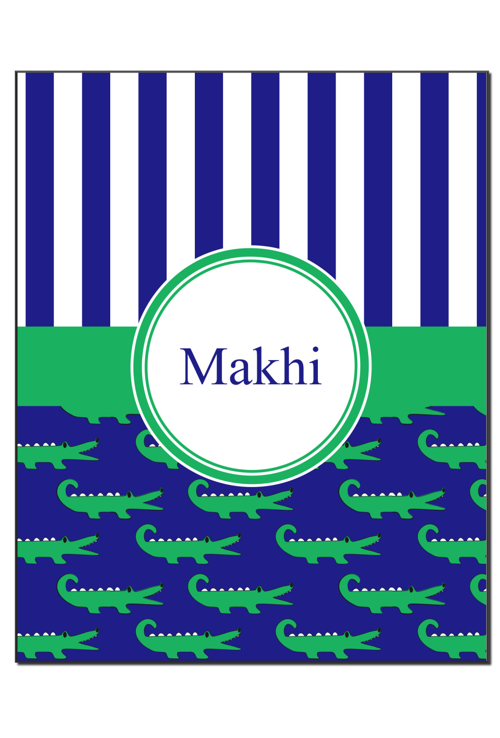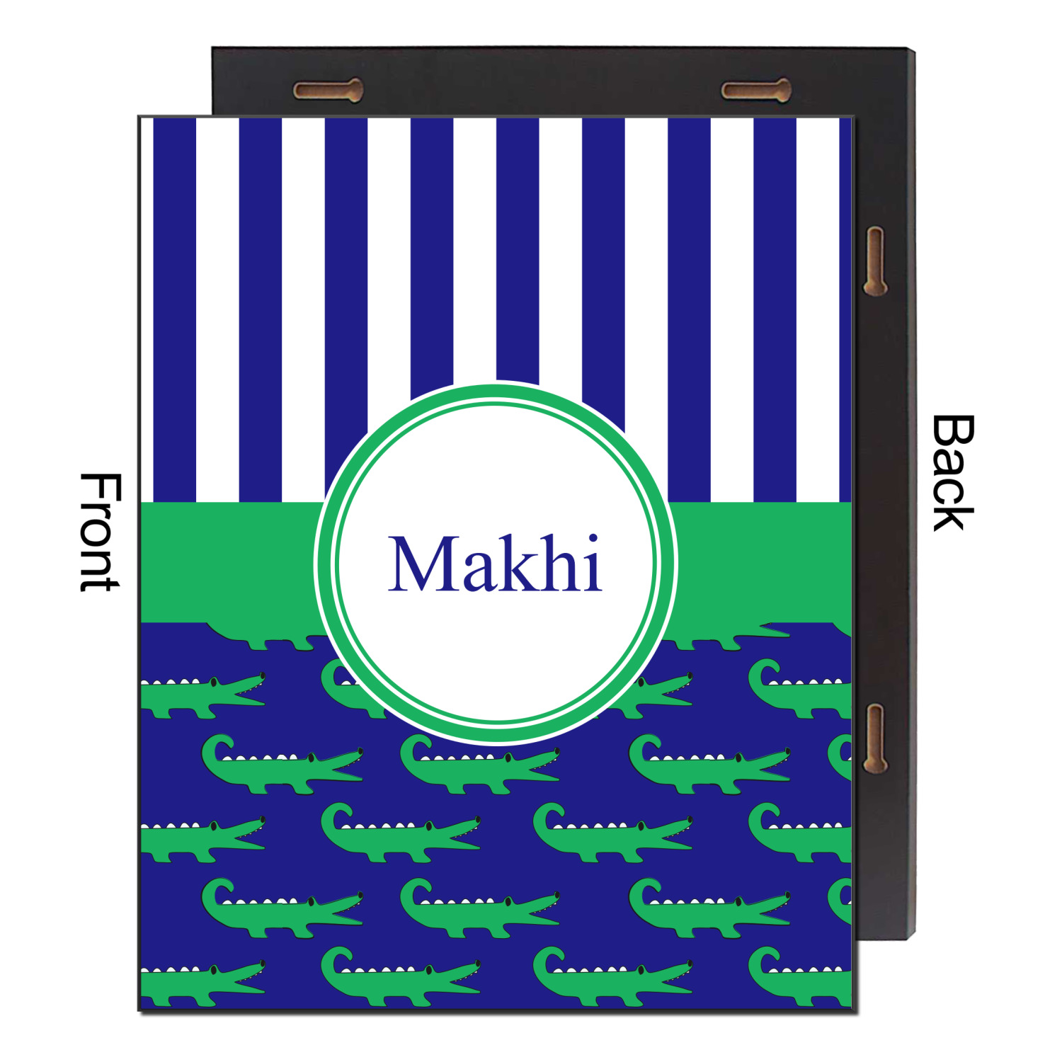 These are the sweetest alligators around! Our adorable green alligators pop and come alive on a blue background. To coordinate the alligator design a bold blue and white striped pattern is added to the top.