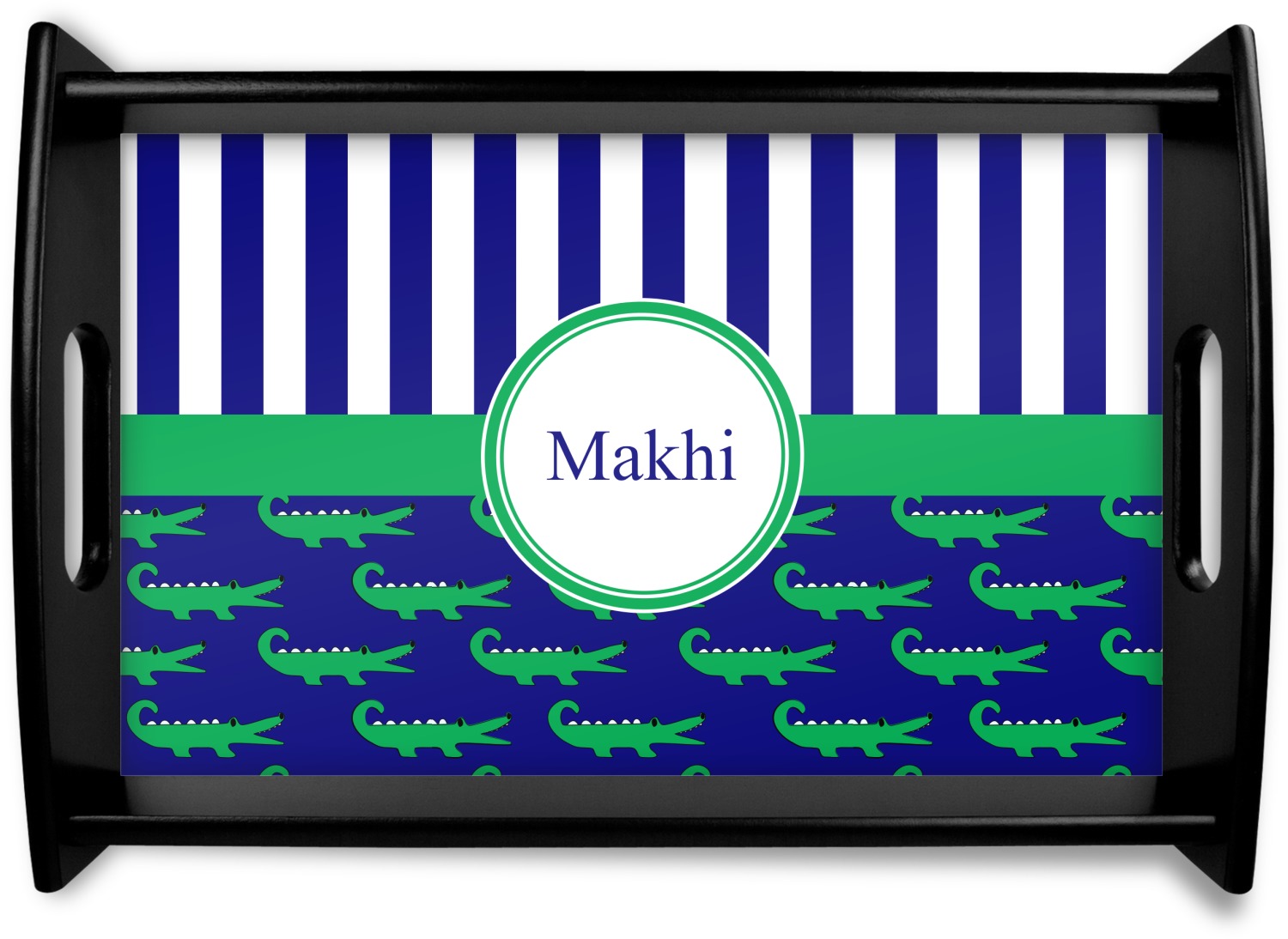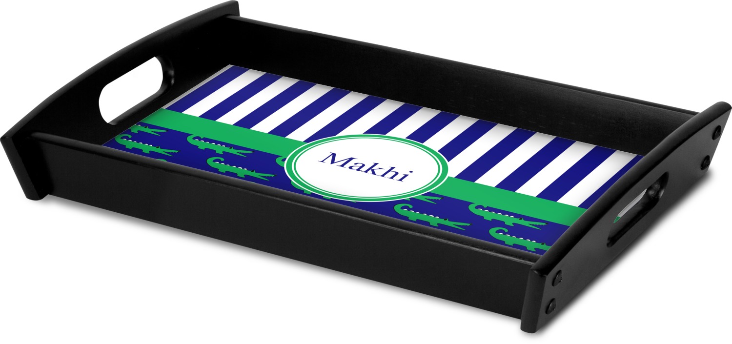 This serving tray with handles features square edges and two rounded sides, creating a very modern look. Each side is fabricated from a beautifully cut, natural wood. The bottom of the interior of the tray displays your customized design in bright, vibrant color. The tray is sold in both a black color and a natural wood look. Each variation of the wood serving tray has two sizes: Small, which is 14" x 10" x 2.25", and Large, which is 19.5" x 13.5" x 2.75".