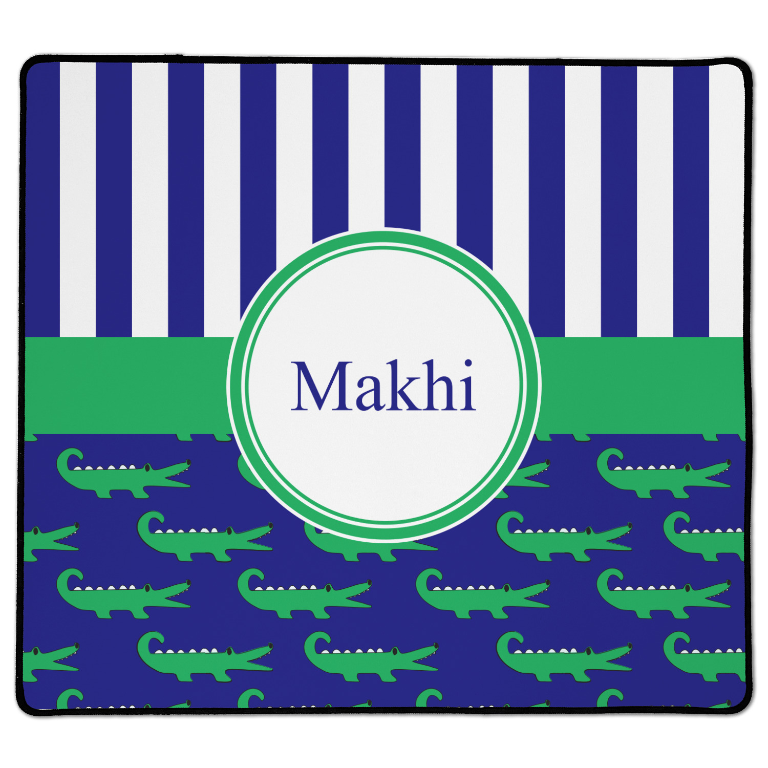 These are the sweetest alligators around! Our adorable green alligators pop and come alive on a blue background. To coordinate the alligator design a bold blue and white striped pattern is added to the top.