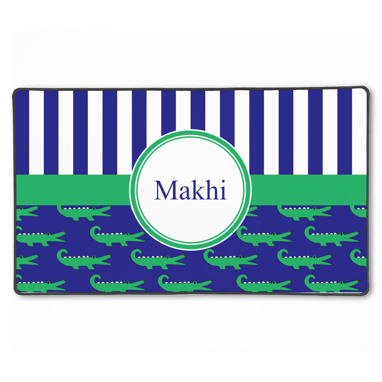 These are the sweetest alligators around! Our adorable green alligators pop and come alive on a blue background. To coordinate the alligator design a bold blue and white striped pattern is added to the top.