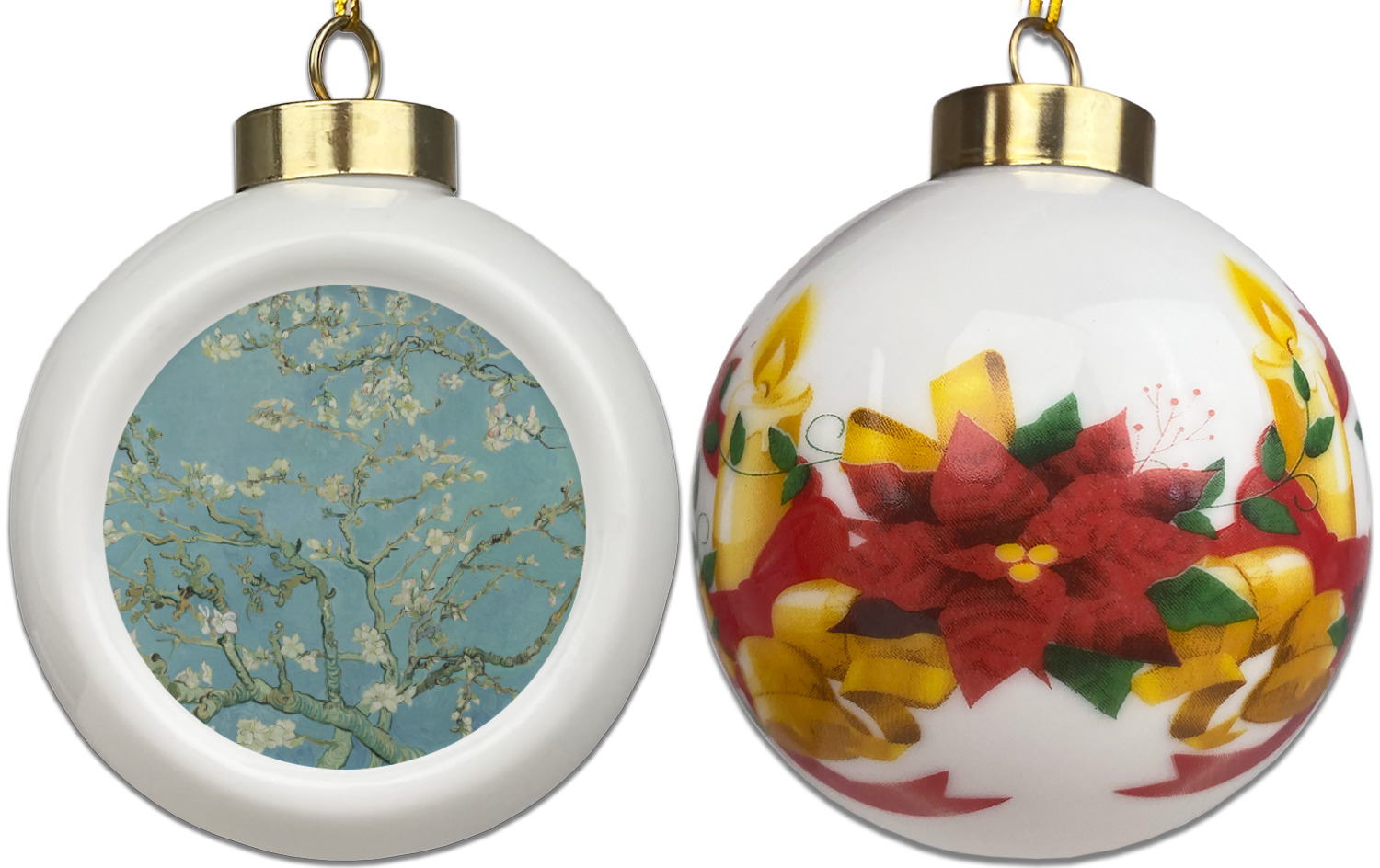 Our Christmas ornaments are a unique ceramic ball shape with a twist as it has a flat face to display your custom design! Select from one of our two design types - Christmas Tree or Poinsettia Garland - to adorn the curved back of your personal design. Each ornament measures 3H x 2.5W x 2D accompanied with a gold string accent for finishing touches to hang on your beautiful Christmas tree!