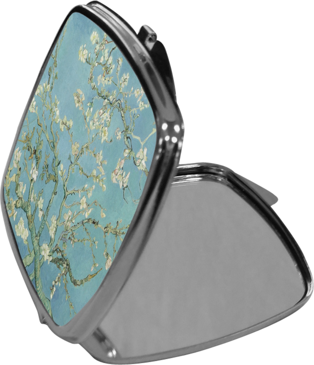 Our compact mirrors are customized with your design on one side. The other side is patterned silver tone metal. Inside, there are two mirrors.